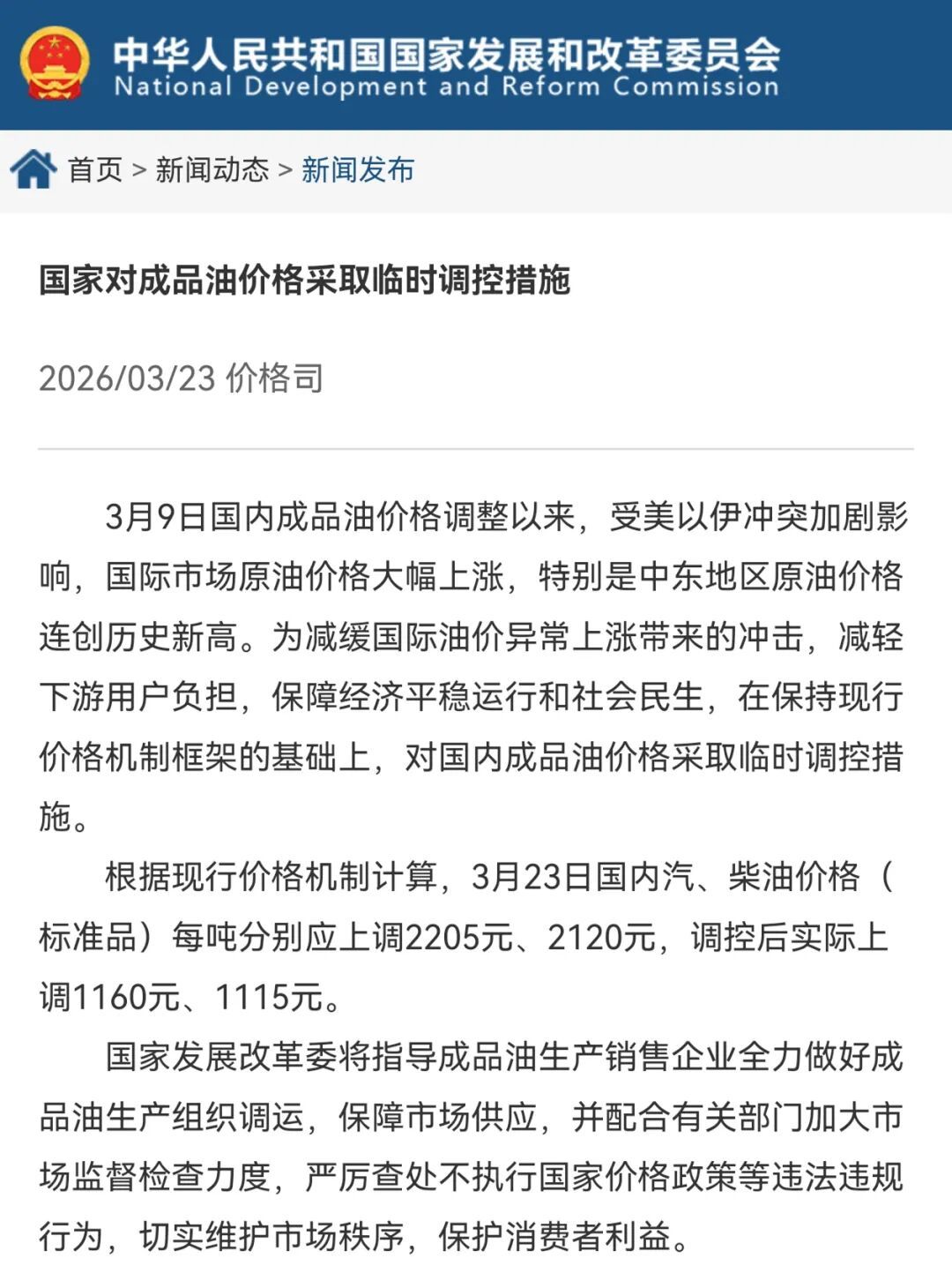 3月9日国内成品油价格调整以来,受美以伊冲突加剧影响,国际市场原油价格大幅上涨,特别是中东地区原油价格连创历史新高。为减缓国际油价异常上涨带来的冲击,减轻下游用户负担,保障经济平稳运行和社会民生,在保持现行价格机制框架的基础上,对国内成品油价格采取临时调控措施。