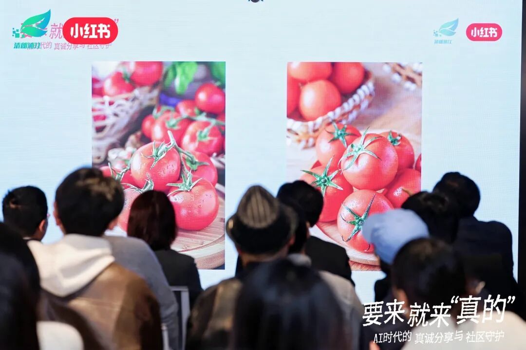 “两张相似的西红柿图片,哪张才是AI作品?”——有趣的暖场活动“这篇你站谁?”从现场大屏展示的两条相似主题内容开始,为观众们直观呈现了:真实优质的创作内容与AI生成内容,在视觉细节和直观感受上到底有什么差异,从而进一步对《小红书社区公约2.0》、平台对AI内容的态度、AI技术滥用带来的网络生态治理难题等方面内容有更为直观和深入的理解。