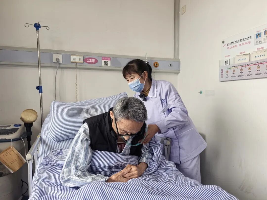 在仁济医院嘉定分院(嘉定区中心医院)胸外科病房里,医疗护理员杨桂枝正在给69岁的张老伯叩背排痰。