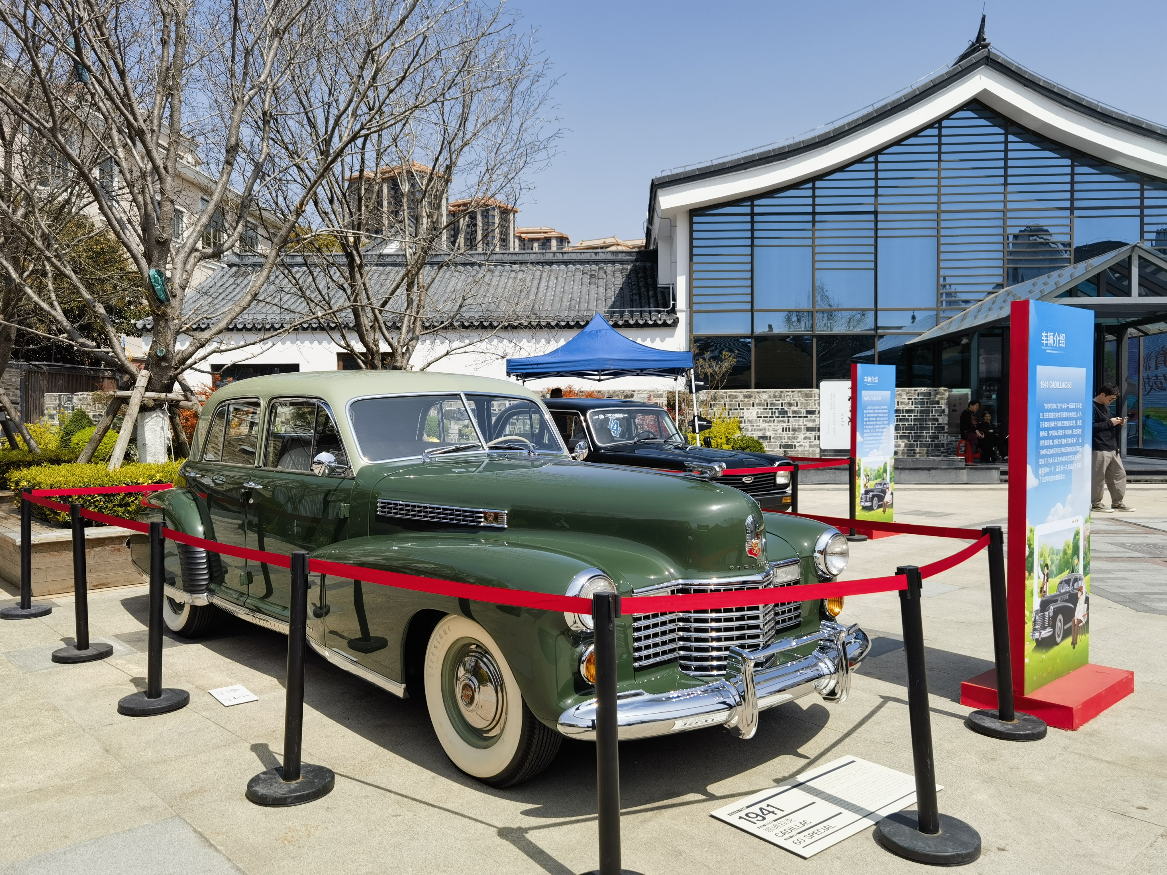 在金石广场,这两台老爷车静静伫立,线条复古优雅,在阳光照耀下,熠熠生辉。其中的初代60 Special问世于1938年,受当时的全球经济危机影响,被称为“最亲民的车系”。自1940年起,60系列归于Fleetwood系列车型名下,许多人认为1941年款是该系列中最美丽的一款。这台老爷车曾是美式豪华的代表作,引擎盖最前端立有一尊银色的飞翔女神立标,姿态优雅,衣摆如翼,与下方飞翼徽标形成上下呼应,尽显气度。盾标主体为红底,上方带有皇冠造型,两侧延伸出标志性的银色羽翼装饰,呈舒展上扬姿态,象征进取与速度,与引擎盖流线感完美呼应,是这一时期凯迪拉克最具辨识度的设计。