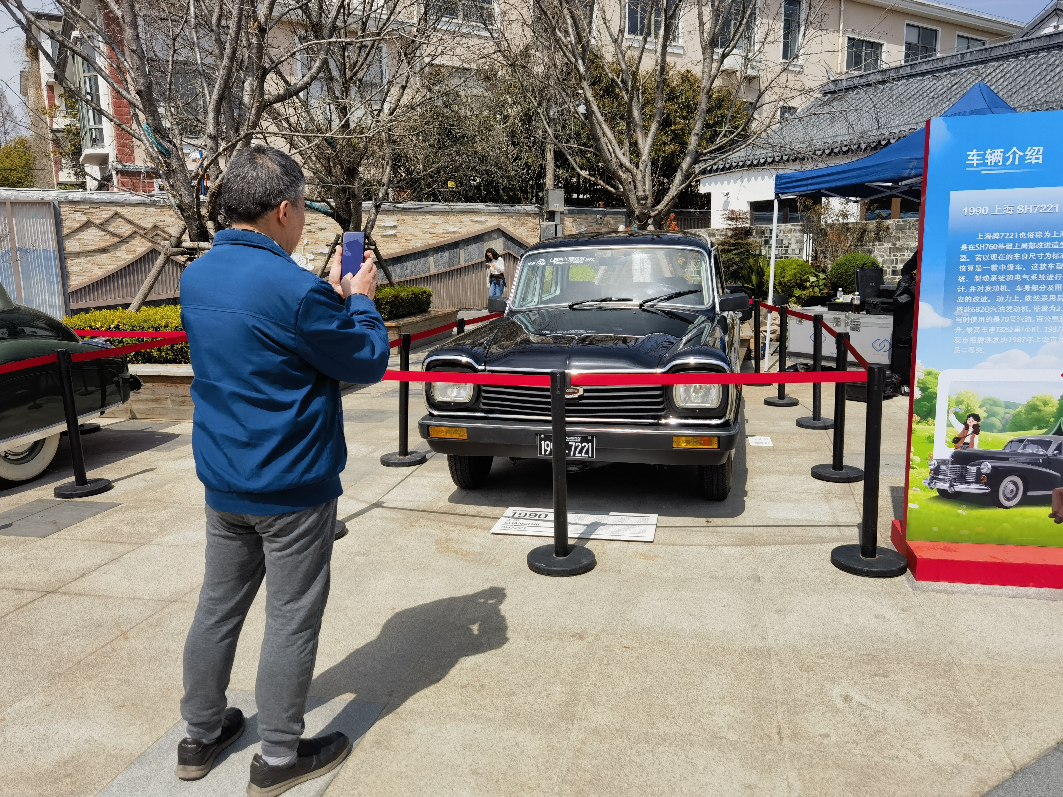 另一台展出的是1990款上海SH7221,俗称上海牌760B,是在SH760基础上局部改进造型而成的车型。若以现在的车身尺寸为标准,该车应该算是一款中级车。这款车型对转向系统、制动系统和电气系统进行了统筹设计,并对发动机、车身部分及附件做了相应改进。1987年,该款车型获市经委颁发的1987年上海市优秀新产品二等奖。在中式白墙黛瓦作衬下,复古汽车与江南古韵相融,格外引人夺目,引得游人纷纷驻足拍照。市民林先生告诉记者:“这种车以往都是在影视剧当中见到的,今天直接呈现在面前,能够近距离感受到复古又精致的韵味。”