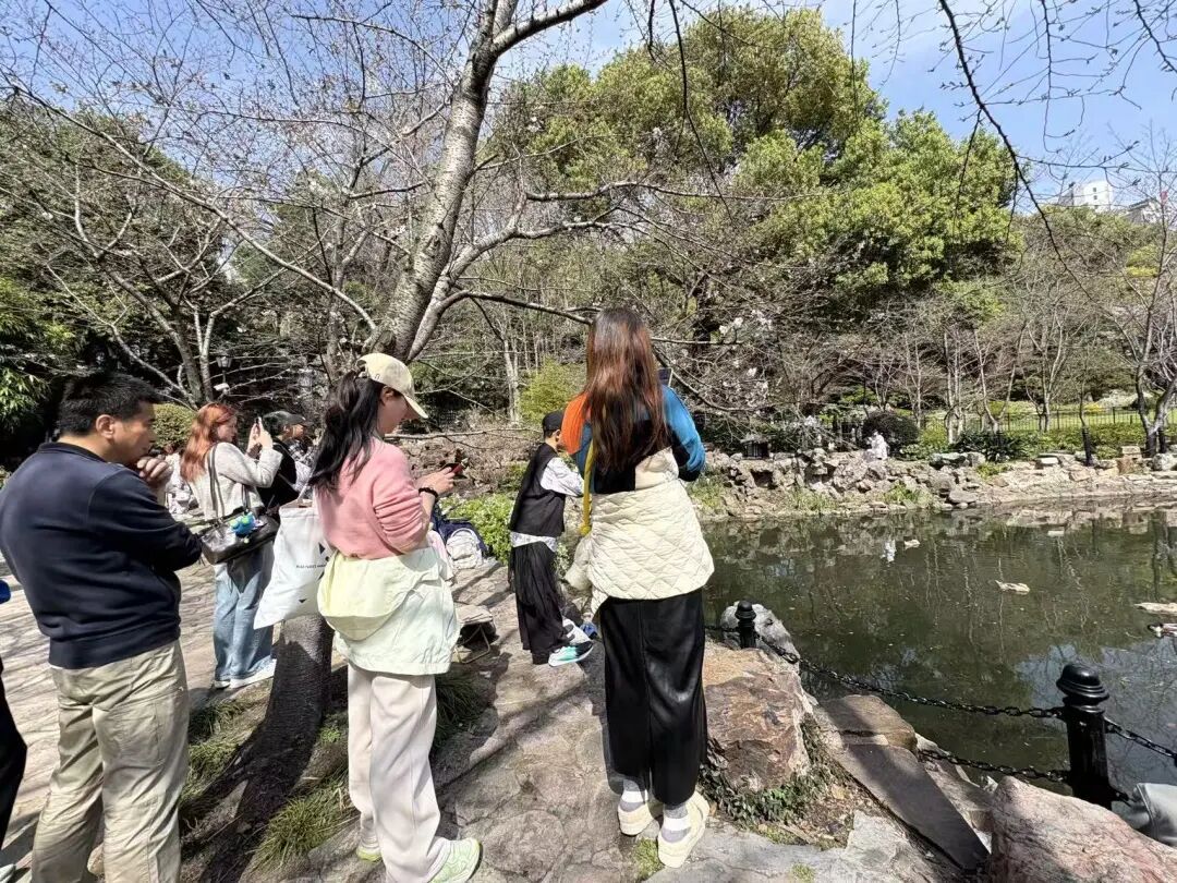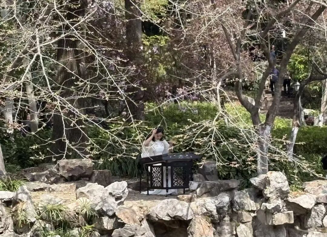 本次演出是樱花节“路尽花深一曲来”音乐系列活动的开篇,将传统民乐的雅致与春日樱枝的静谧意境完美融合。演出现场,樱枝缀满饱满花苞、池水含韵,悠扬乐声随风漫溢,与眼前景致交织成趣。一个小时的表演中,扬琴独奏、京剧选段、笛子独奏及扬琴与笛子合奏等多种形式轮番呈现,丰富的表演内容吸引众多市民游客驻足观赏、静静聆听,沉浸式感受传统民乐与春日风光的碰撞之美。