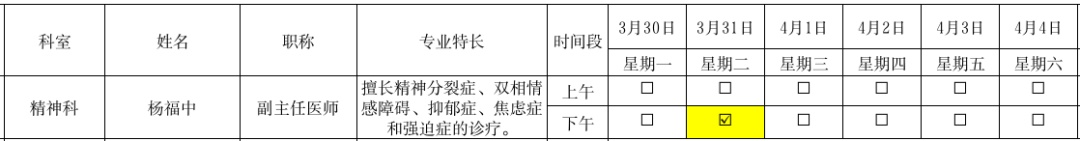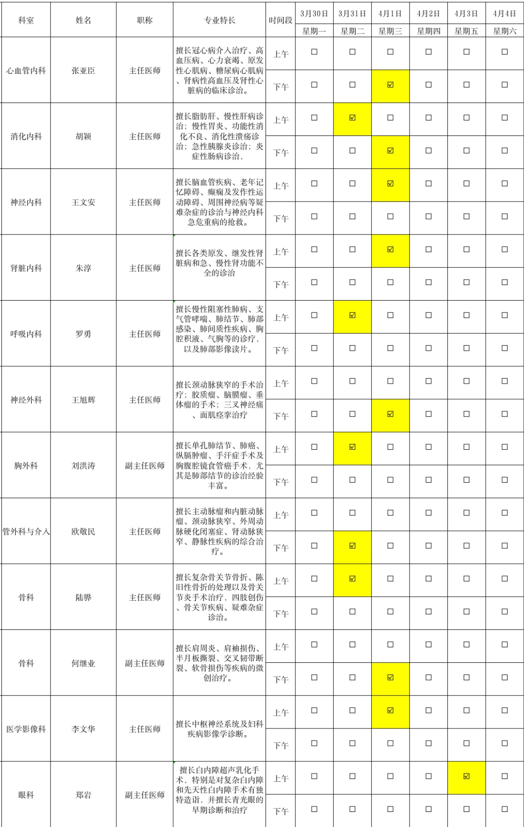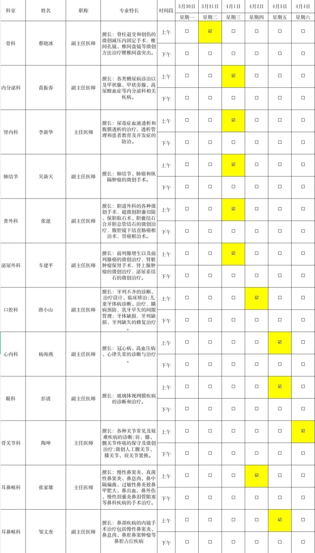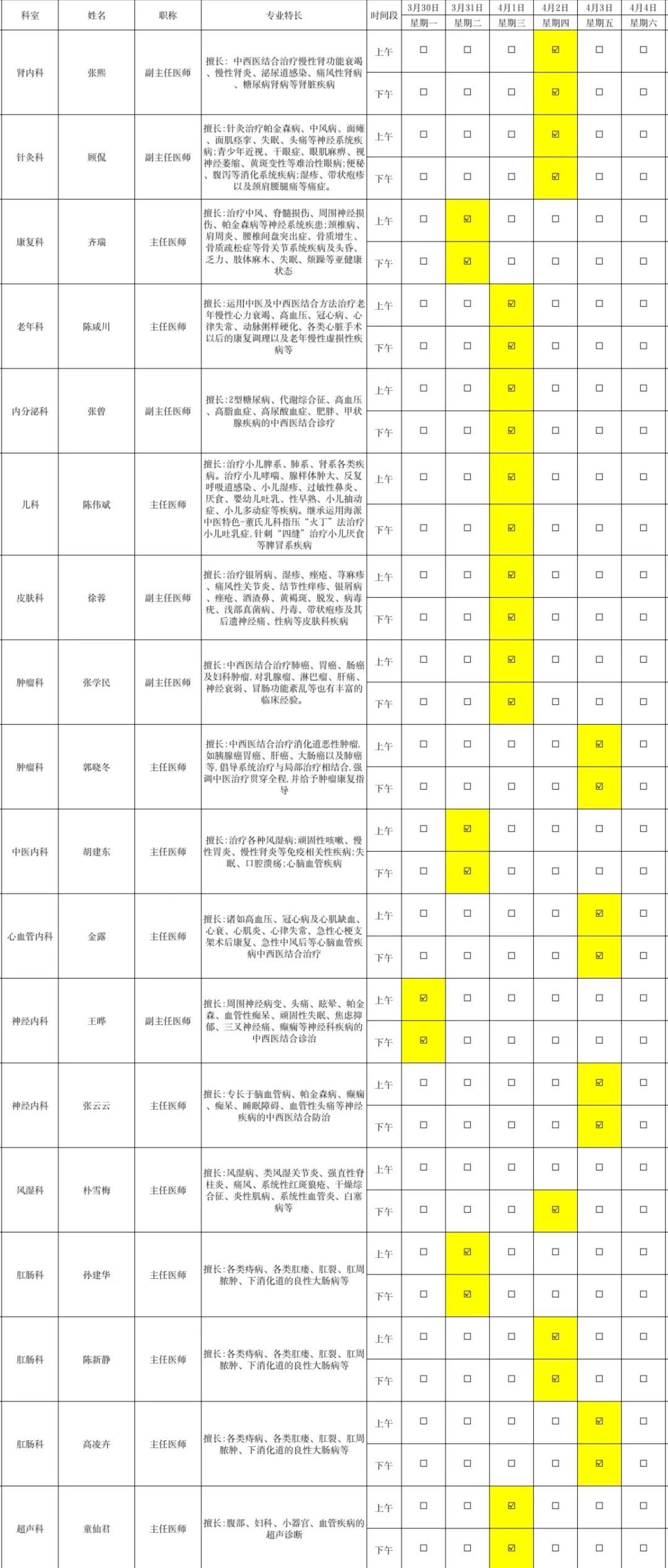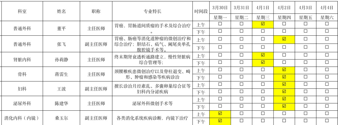 以下为2026年3月30日-4月4日市区医院下沉专家坐诊信息一览表,供广大市民参考。