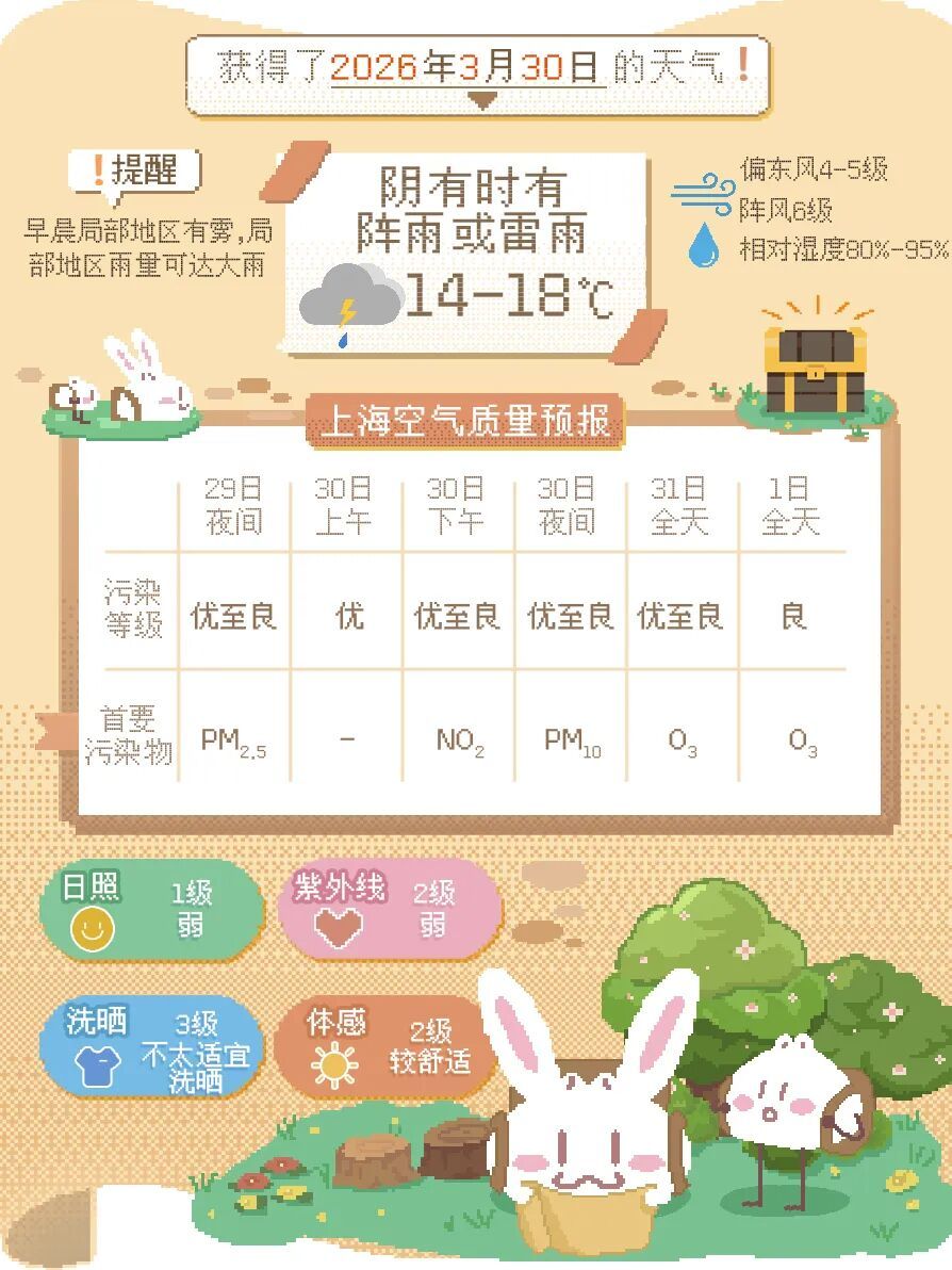 受江淮气旋影响,今天(3月30日)白天为阴有时有阵雨或雷雨的天气,局部地区累积雨量可达大雨,预计今天夜里起雨势减弱,转阴到多云有短时小雨。偏东风4~5级阵风6级,傍晚起转偏北风5级阵风6~7级,沿江沿海地区更大一些。今天相对湿度95%~80%,最高19℃,体感偏暖湿。