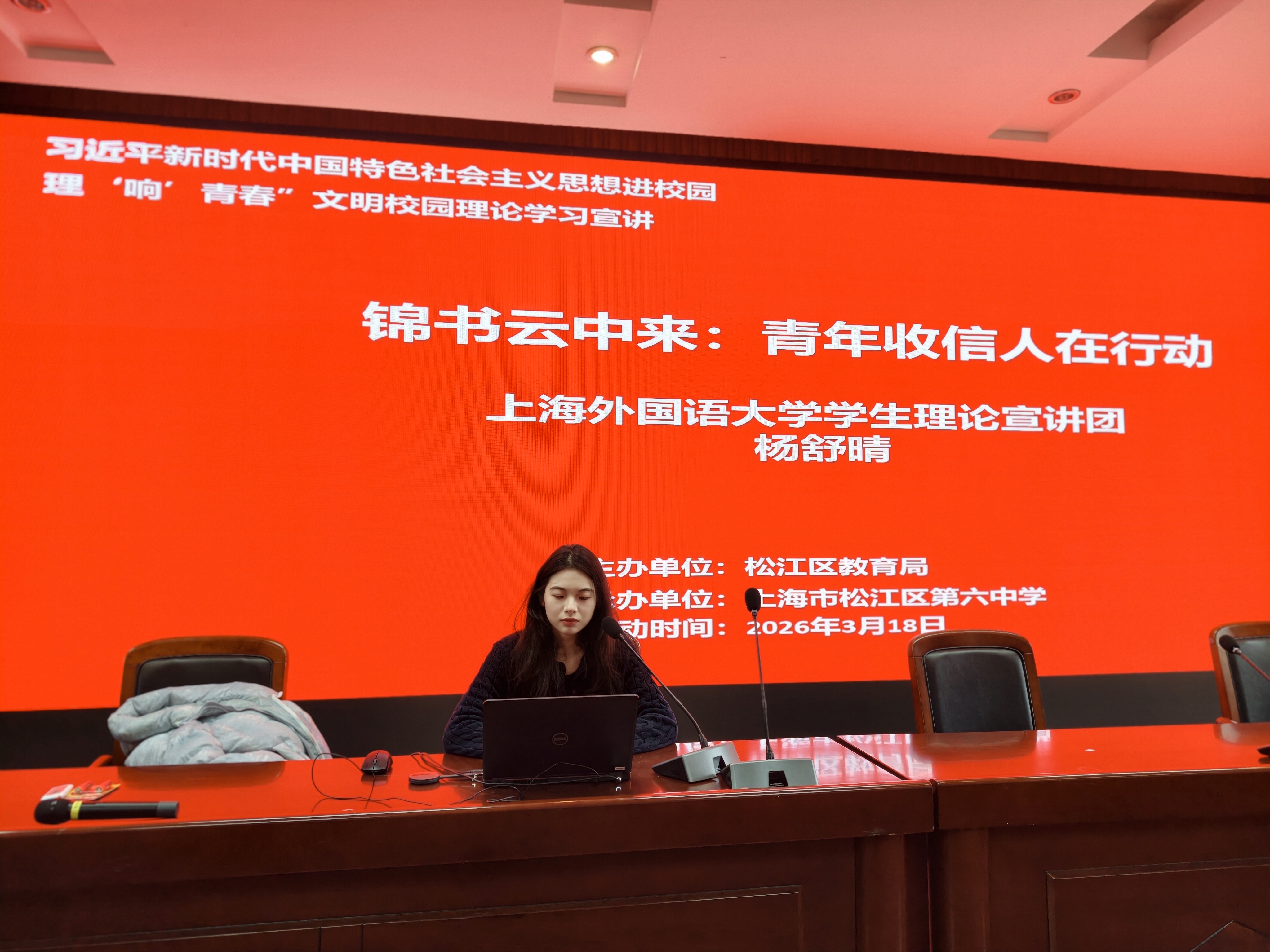 3月18日,在松江六中举行的“云中锦书来:青年收信人在行动”主题理论宣讲活动上,上海外国语大学大学生杨舒晴以“时代书信”为脉络,从理想、担当、吃苦、奋斗四个角度勾勒出不同时代青年人为国奋斗、奉献的价值选择与担当故事,带领六年级学生细细品读方志敏、杨开慧等革命先辈的红色家书,为他们带来深厚的家国情怀滋养。