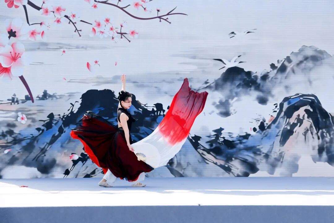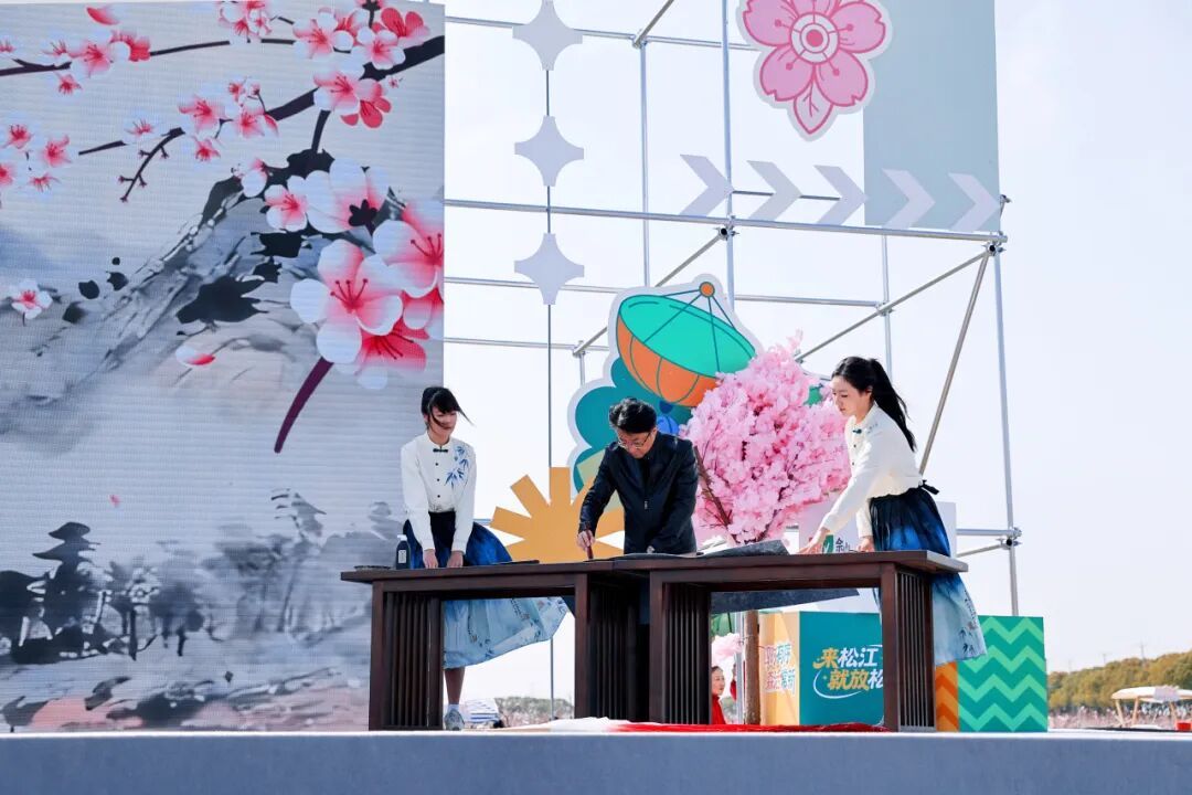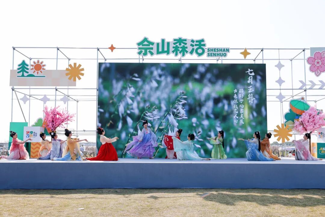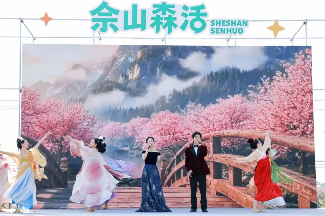 活动在“霞之韵舞蹈队”带来的手拍鼓舞蹈《桃花笑》中火热开场。2026年初预先启动的“花神月”子活动集锦VCR,生动再现了非遗手作、春日登高、乡村市集等全域联动的美好瞬间。上海政法学院刘星显副教授与刘亮老师联袂呈现音舞诗画《佘山春韵》,以尺八、古典舞与笔墨国风相融,尽显佘山春日风雅气韵。