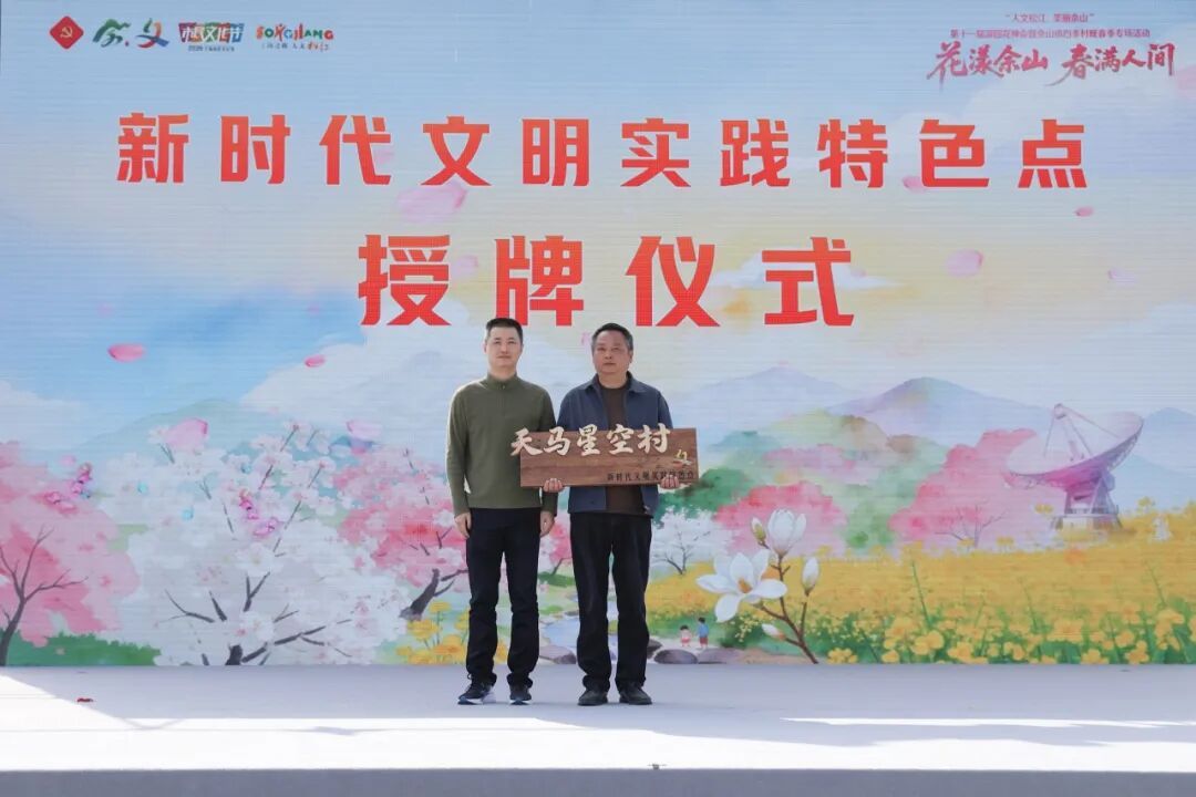 小主持人和信瑜果业负责人共同讲述了“桃花深处有人家”的故事,分享了“天马星空村”乡风文明、兴农致富的故事,生动展现了新时代新农人的担当与鲜活力量。情景剧《星空下的新邻里》温情上演,聚焦村集体共商文明养犬公约、非遗打莲湘融合时代新风的场景,勾勒宜居和美乡村新图景。活动现场进行了“天马星空村”新时代文明实践点授牌。