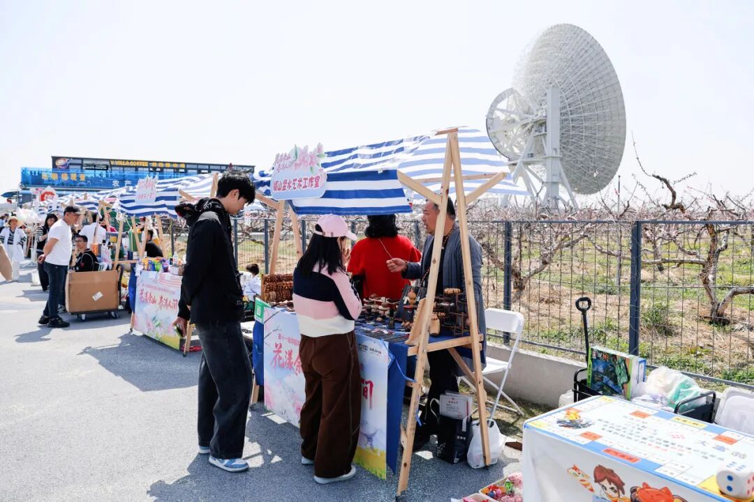 主舞台精彩纷呈,场外体验同样热闹。天马星空村的各家商铺内,手作糕点、沉香挂件等趣味手工体验项目人气满满;星空大道上,四十个摊位沿路排开,非遗手作、文创潮品、佘山特色糕点等一应俱全,满是春日人间烟火气。