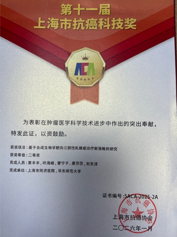 近日,2025年第十一届上海市抗癌协会科技奖揭晓,同济大学附属同济医院乳腺外科中心蔡丰丰主任医师领衔的《基于合成生物学靶向三阴性乳腺癌治疗新策略的研究》项目荣获二等奖 。针对三阴性乳腺癌这一临床诊治难点,基于合成生物学理念在精准诊疗上取得系统性突破,有力推动了我国三阴性乳腺癌从“经验治疗”向“精准治疗”的跨越。