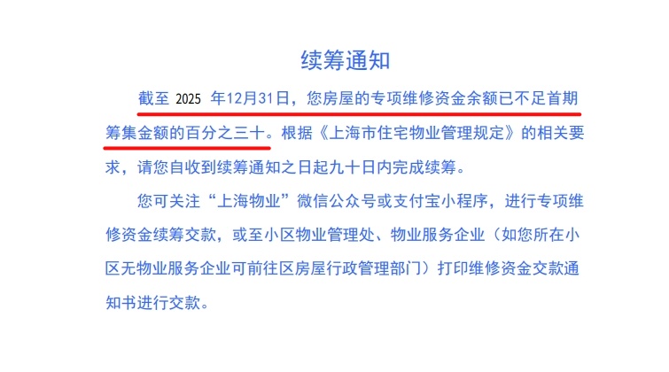 根据《上海市住宅物业管理规定》的相关要求,当维修资金余额不足首期筹集金额的30%时,需要进行续筹。