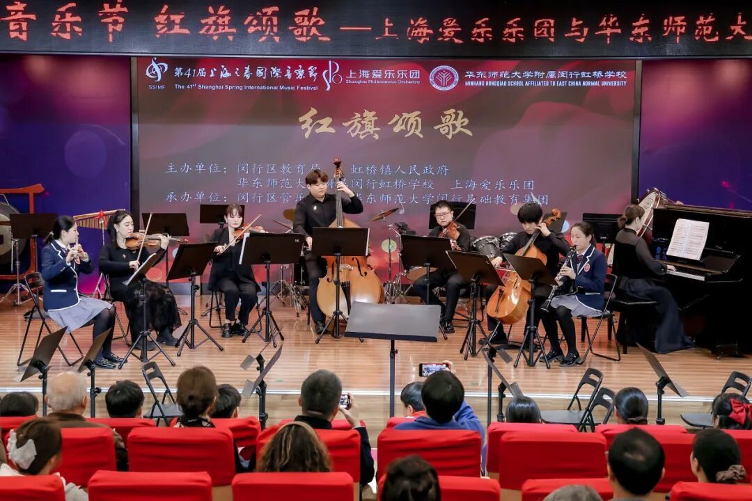 3月30日下午,第41届上海之春国际音乐节专场演出——“红旗颂歌”公益交响音乐会在华东师范大学附属闵行虹桥学校举行。