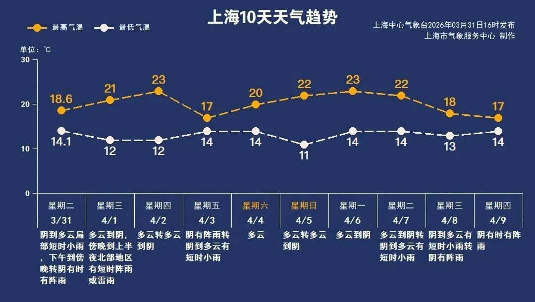 周四气温进一步走高,最高可达23℃。周五还有一场雨,雨势较为明显,阴雨打压,最高气温回落至17℃。周六到下周一,本市以多云天气为主,最高气温又可接近23℃。春季天气系统活跃、晴雨转换快,请及时关注最新的天气变化,合理安排生活和出行。