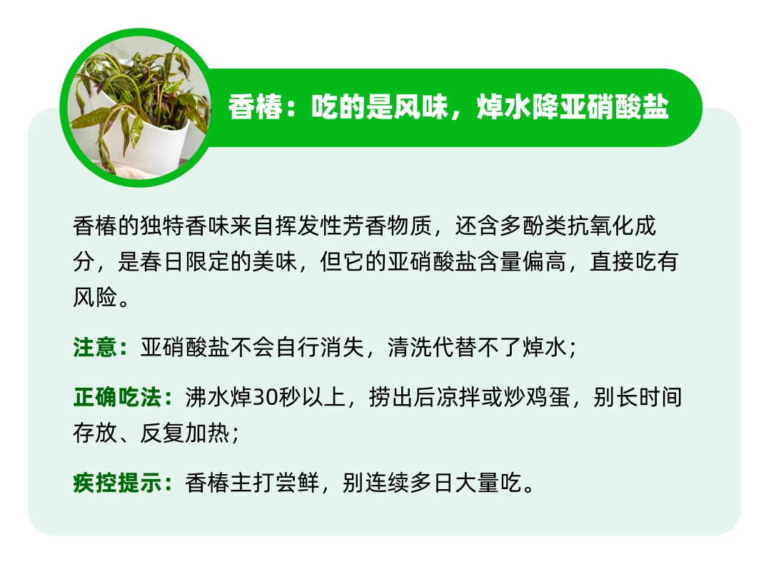 香椿的独特香味来自挥发性芳香物质,还含多酚类抗氧化成分,是春日限定的美味,但它的亚硝酸盐含量偏高,直接吃有风险。