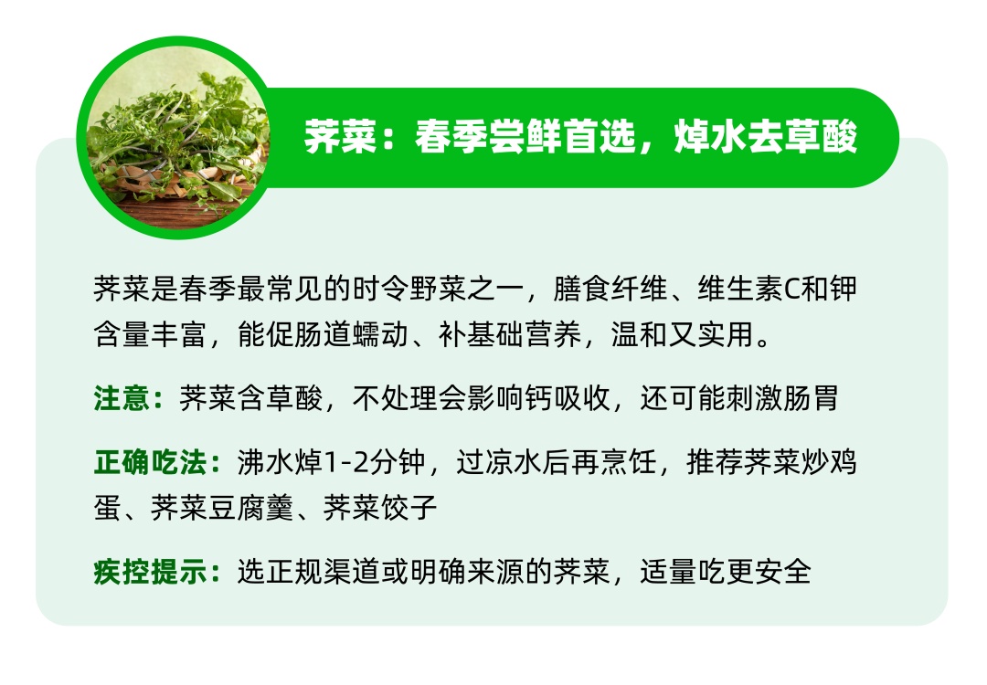 5. 春日尝鲜的安全方式是选正规渠道的时令菜,做好处理和烹饪,不盲采、不猎奇才是关键。