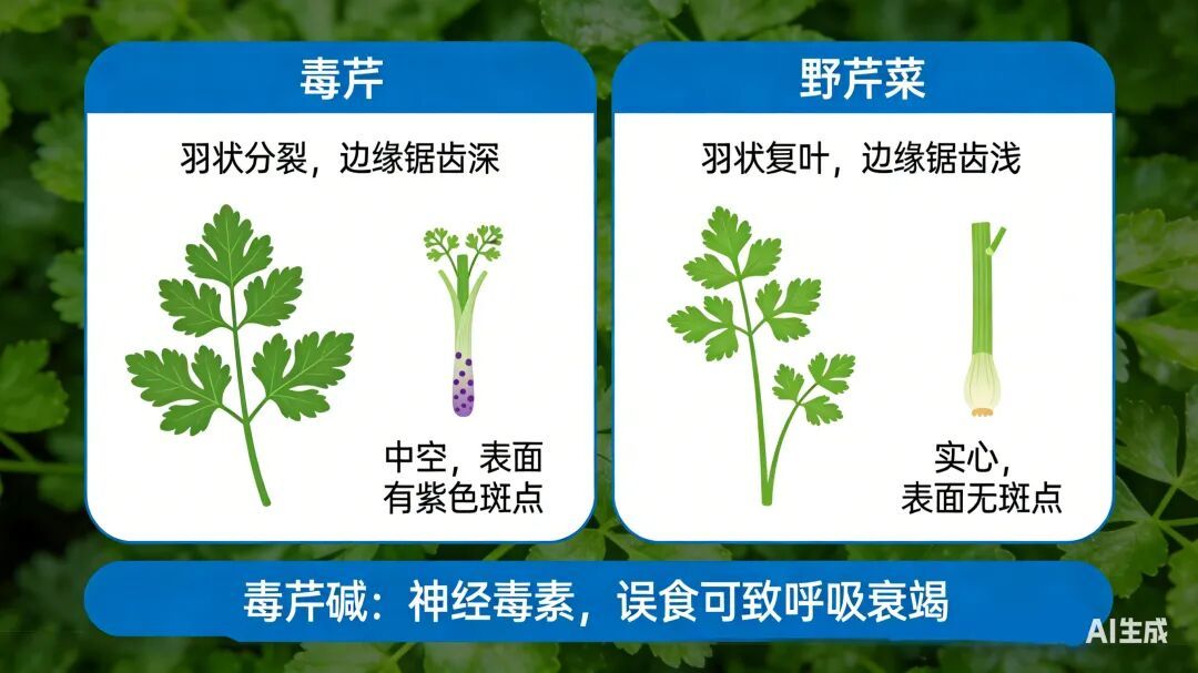 毒芹幼苗和野芹菜、石芹长得几乎一模一样,气味也相近,很容易被误采。但实验室检测发现,毒芹含毒芹碱——一种强效神经毒素,会抑制神经传导。