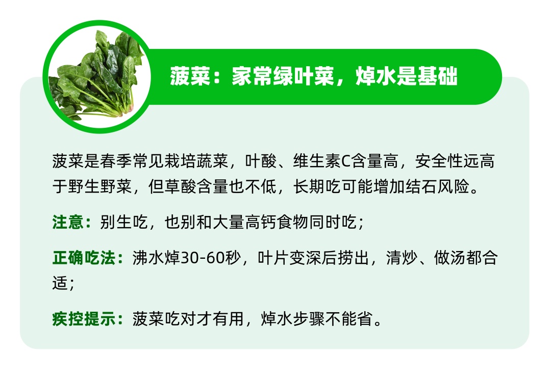 菠菜是春季常见栽培蔬菜,叶酸、维生素C含量高,安全性远高于野生野菜,但草酸含量也不低,长期吃可能增加结石风险。
