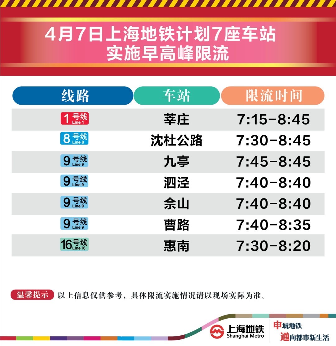 4月7日早高峰莘庄、沈杜公路等7座地铁站计划限流