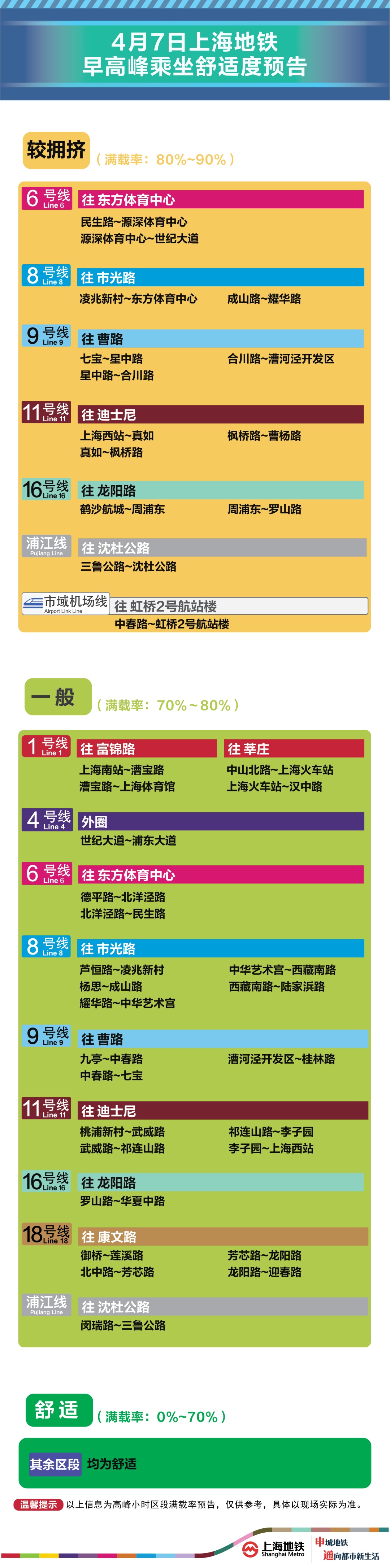 为提升上海地铁早高峰期间出行服务水平,提升乘客乘坐体验,上海地铁向乘客提供乘坐舒适度预告,方便乘客提