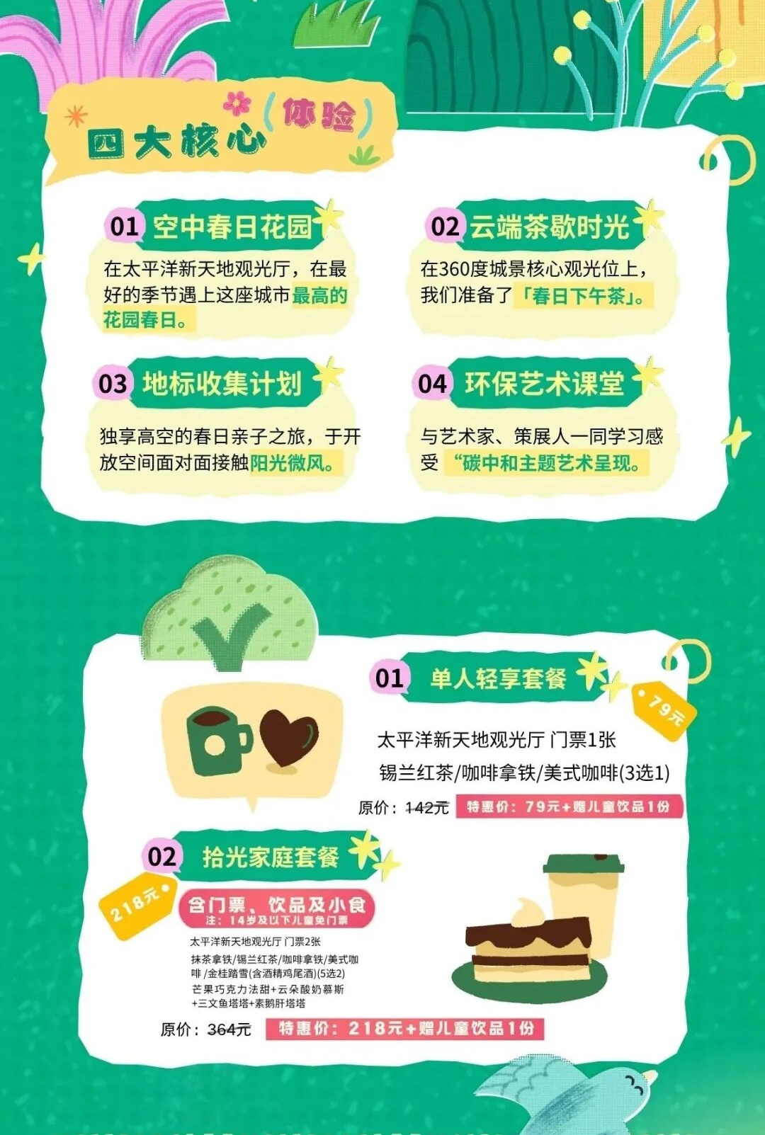 即日起至4月6日,太平洋新天地观光厅推出“春日追光计划”,两款限时特惠套餐任你挑选。单人轻享套餐(79元含:太平洋新天地观光厅门票1张+锡兰咖啡/咖啡拿铁/美式咖啡(3选1))、拾光家庭套餐(218元含:门票、饮品及小食,赠儿童饮品1份)。