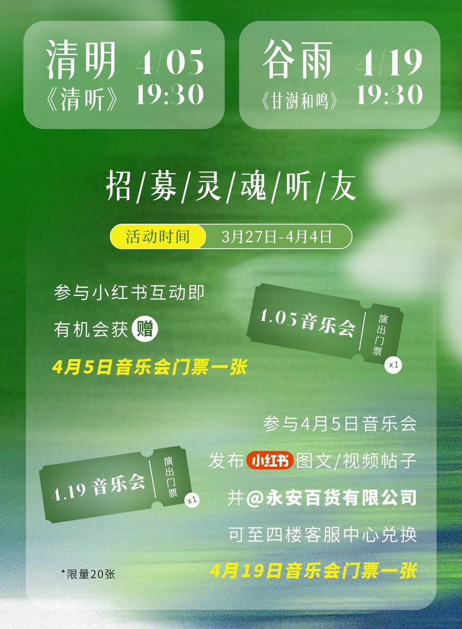 永安百货灵感大进发,甄选春日好物,嗨享多重福利!进口化妆品8折起、女士春装3折起、男士春装3.5折起,以及户外服饰3.9折起...还有家电焕新折扣补贴哦~此外,即日起至4月4日,参与小红书互动既有机会获赠音乐会门票哦~