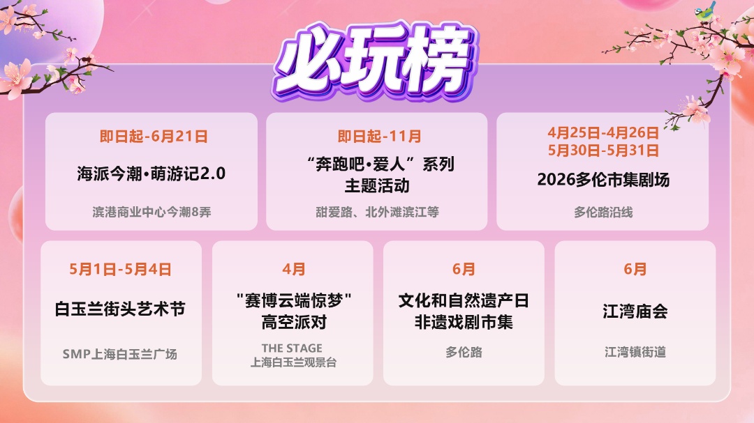 必玩榜潮趣升级,解锁花式春夏玩法。滨港商业中心今潮8弄“海派今潮·萌游记2.0”持续至6月21日,打造“户外人宠共生+室内自然疗愈”双线场景,四大篇章、100余场活动覆盖五一、母亲节等多个节点,宠物工坊、屋顶音乐会、身心灵疗愈等玩法轮番上线;多伦路沿线2026多伦市集剧场于4月25-26日、5月30-31日开启,文创市集与戏剧互动深度融合,尽显文化街区独特魅力;“奔跑吧·爱人”系列主题活动联动甜爱路、北外滩滨江等浪漫地标,为伴侣打造专属互动体验;5月1-4日SMP上海白玉兰广场白玉兰街头艺术节,以运动、音乐、艺术、市集打造黄金周潮流盛会,6月1日多伦路文化和自然遗产日非遗戏剧市集、江湾镇街道江湾庙会,更让传统民俗与新潮体验碰撞出别样火花。