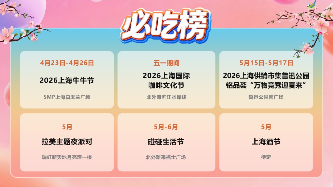 必吃榜烟火飘香,舌尖美味邂逅风光。4月23-26日,SMP上海白玉兰广场2026上海牛牛节汇聚数十家头部餐饮,干式熟成牛排、炭烤和牛等全牛美味搭配江景体验,兼具高端质感与烟火气;五一期间,北外滩滨江水岸线2026上海国际咖啡文化节盛大启幕,咖啡市集联动潮玩、演艺、文旅,打造咖啡主题消费盛宴;5月1日瑞虹新天地月亮湾一楼拉美主题夜派对,墨西哥塔可、巴西烤肉等异域风味搭配拉丁音乐舞蹈,沉浸式感受美洲风情;5月-6月北外滩来福士广场碰碰生活节打造国际啤酒节,碰杯交友解锁潮饮新体验;5月15-17日鲁迅公园南广场上海供销市集“万物竞秀迎夏来”,源头直供的生鲜、土特产还原传统市集烟火气,5月1日启幕的上海酒节更汇聚美酒、美食、美乐,打造沉浸式酒类消费嘉年华。