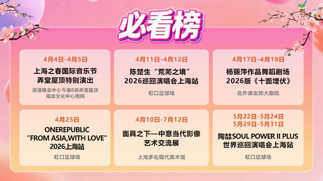 必看榜星光熠熠,艺术盛宴轮番上演。4月4-5日,上海之春国际音乐节弄堂屋顶特别演出空降今潮8弄,俄派室内乐与汉堡青年爵士乐在百年弄堂奏响;陈楚生“荒芜之境”、ONEREPUBLIC"From Asia,With Love"、陶喆Soul Power II Plus三大顶流演唱会接连登陆虹口足球场,从“三体机械魔盒”动态舞台到经典金曲演绎,带来世界级视听享受;北外滩友邦大剧院好戏连台,胡伟立重现经典音乐会、杨丽萍2026版《十面埋伏》、凡人修仙传动画视听音乐会轮番登场,武侠旋律、东方舞美、动漫原声各有精彩;4月10日至7月12日,上海多伦现代美术馆“面具之下—中意当代影像艺术交流展”,携手意大利驻沪领馆打造国际文化交流盛宴,让市民在家门口邂逅世界级艺术。