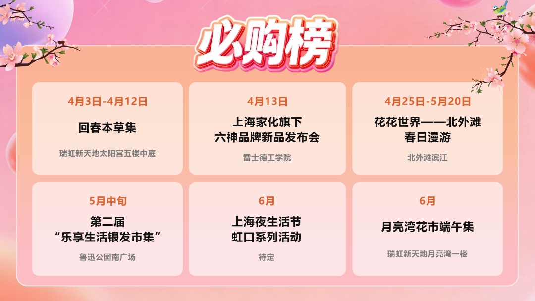 必购榜好物云集,春夏消费焕新出发。4月3-12日,瑞虹新天地太阳宫五楼中庭“回春本草集”启幕,以新中式养生为核心,汇聚非遗中医诊疗法、老字号及中医药文创品牌,百余场体验活动开启春日养生盛宴;4月13日雷士德工学院上海家化六神品牌新品发布会,解锁夏日新品与趣味互动;4月25日至5月20日,北外滩滨江“花花世界——春日漫游”以花卉景观为引,联动商圈推出市集、打卡、巡游等活动;5月中旬鲁迅公园第二届“乐享生活银发市集”,集结养老科技、营养保健等适老好物;6月1日瑞虹新天地月亮湾一楼月亮湾花市端午集,50+花植品牌搭配端午民俗体验,上海夜生活节虹口系列活动同步启动,夜间消费场景持续焕新,为市民打造一站式采购新阵地。
