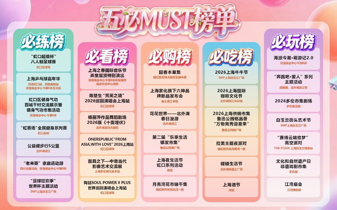 本次发布的2026年第二季度文商旅体展系列活动及五必MUST榜单,以超百场特色活动覆盖玩、看、购、吃、练五大维度,串联虹口滨江、百年弄堂、核心商圈、文化地标等特色空间,让市民游客在春夏尽享沉浸式、多元化的文旅消费体验。
