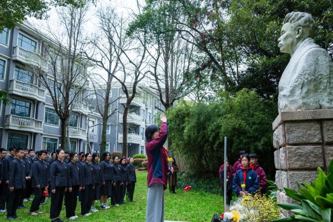 “我们不仅要讲述侯绍裘烈士本身的生平事迹,更要用心领悟他的英烈精神如何影响一代又一代后辈。身处和平年代,仍需锤炼品格,树立远大理想。”来自松江二中校史宣讲团的学生宣讲员姜惜墨,追忆了侯绍裘烈士将个人命运与民族解放紧紧相连的光辉事迹。听完她的讲述,师生们肃立塑像前,凝神追思。