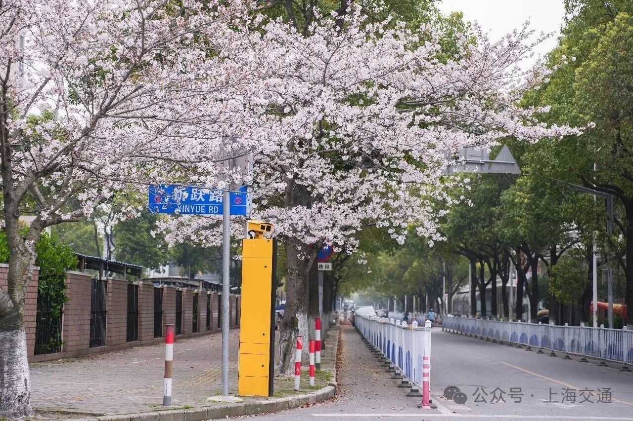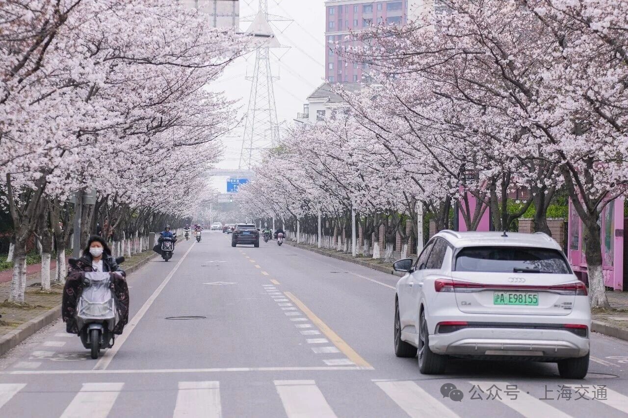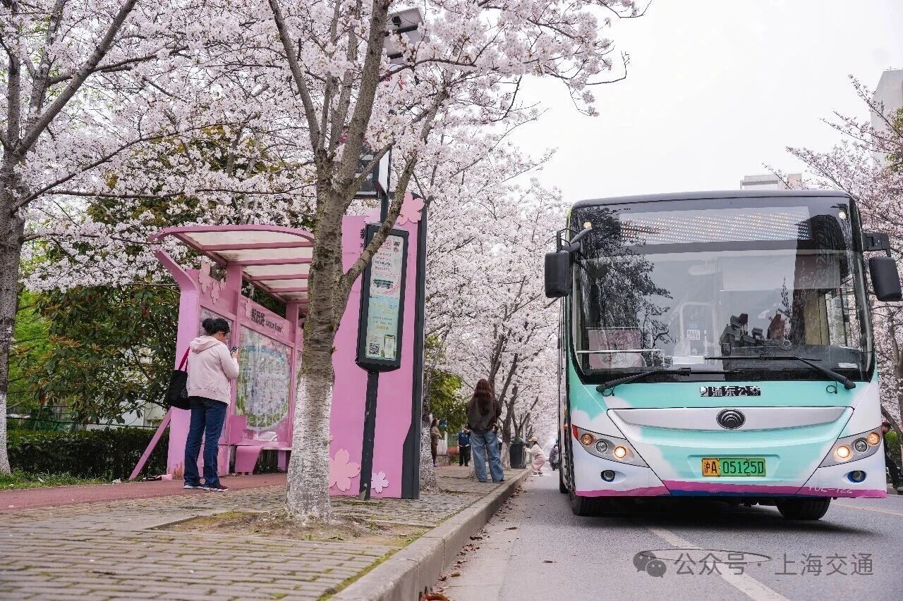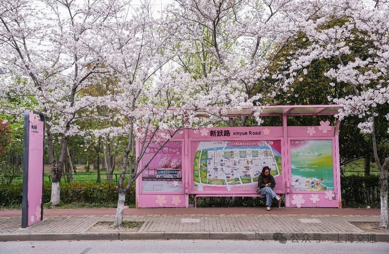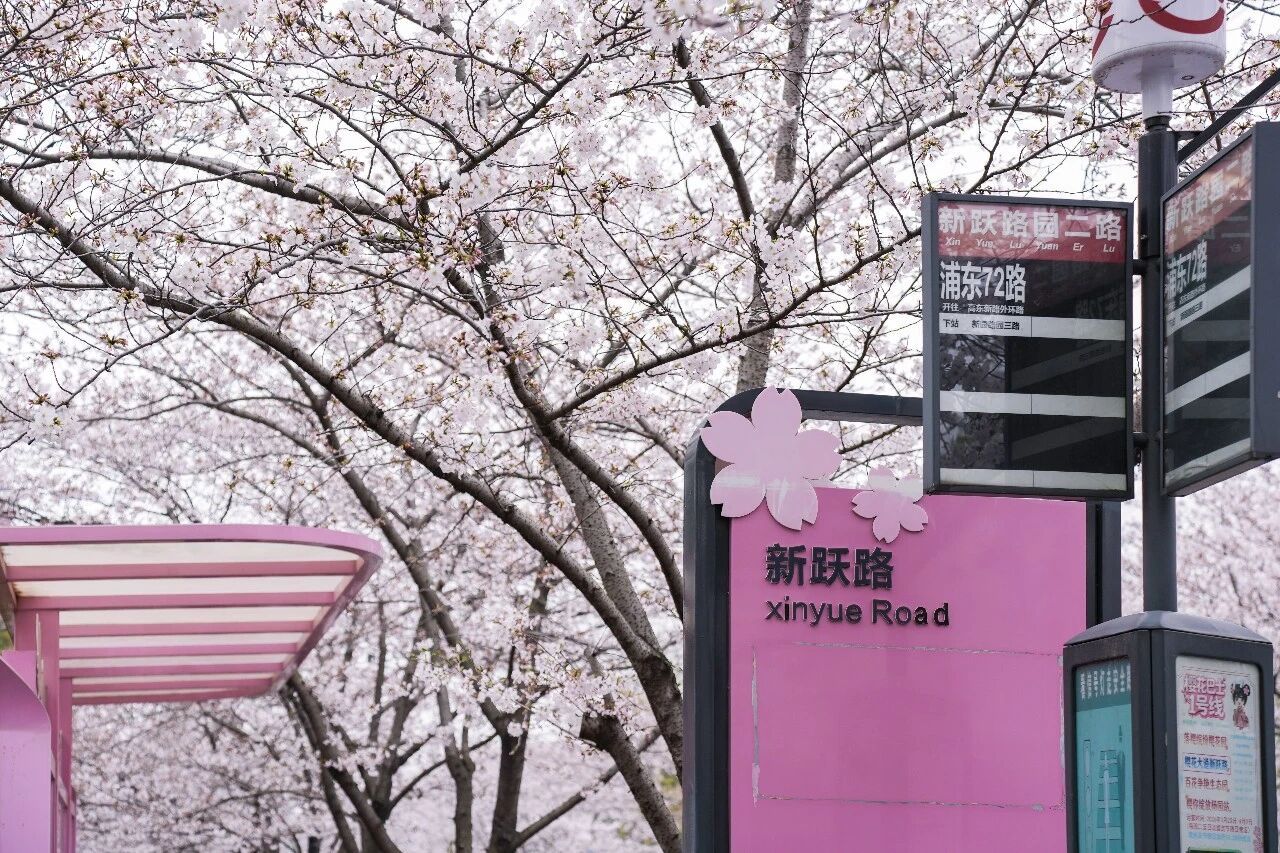 这里是浦东“樱花大道”新跃路,公交站周边的樱花已成排绽放,粉白花瓣缀满枝头,微风拂过,花瓣簌簌飘落,铺就出浪漫小径。樱花与往来公交相映成趣。无论通勤途中或闲暇漫步,都能邂逅这份贴近生活的春日温柔,感受申城街头的樱花诗意。