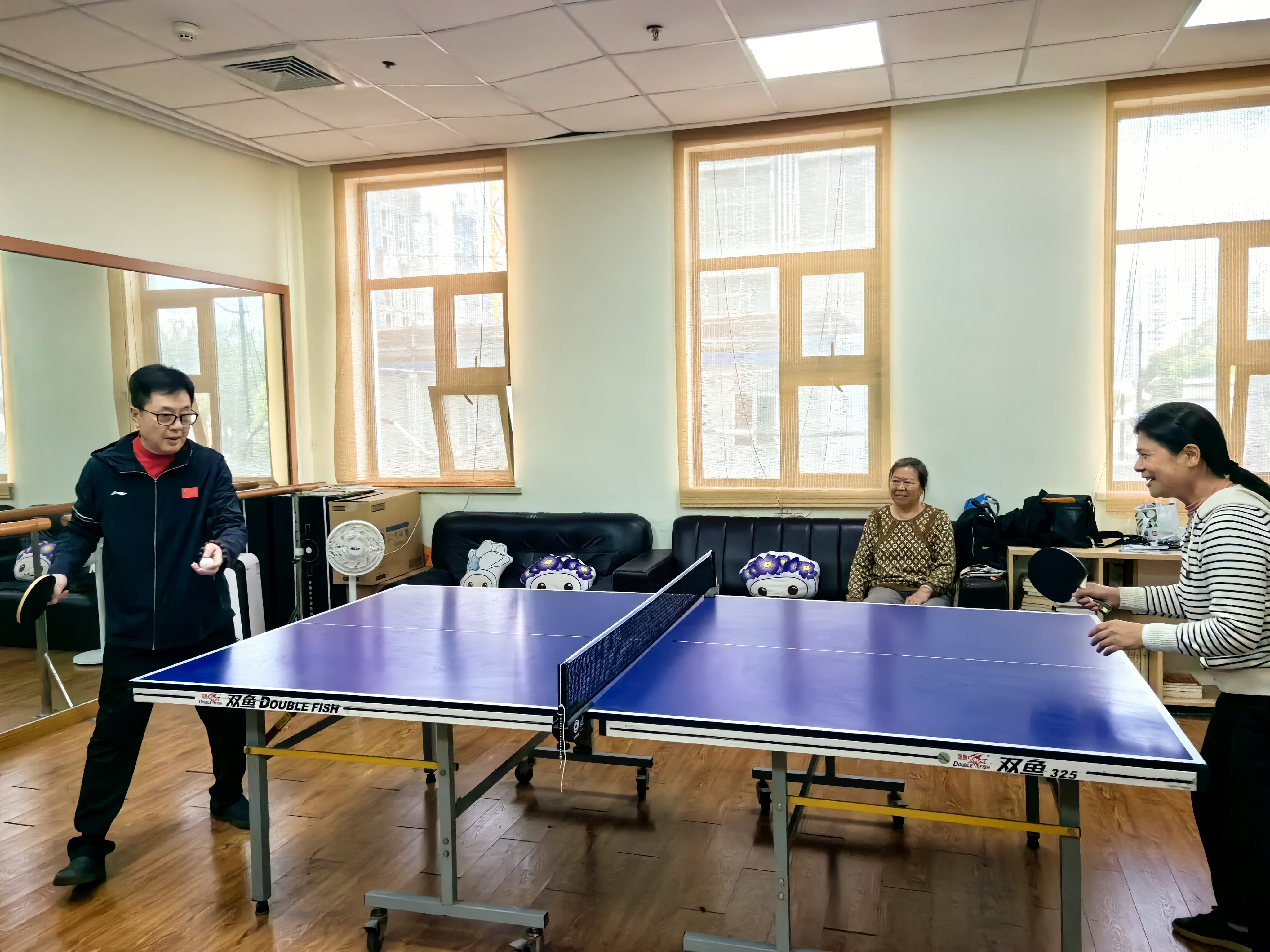 挥拍、对攻、搓球……在豫园街道社区卫生服务中心的活动室内,几张乒乓球桌整齐排开,全自动发球机不停送出“来球”,几位老人正与一位特殊“陪练”切磋球技——著名乒乓球运动员、教练施之皓的到来,让这个“老有所练”乒乓乐园项目现场的气氛格外热烈。