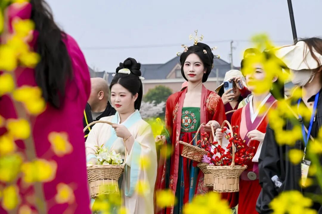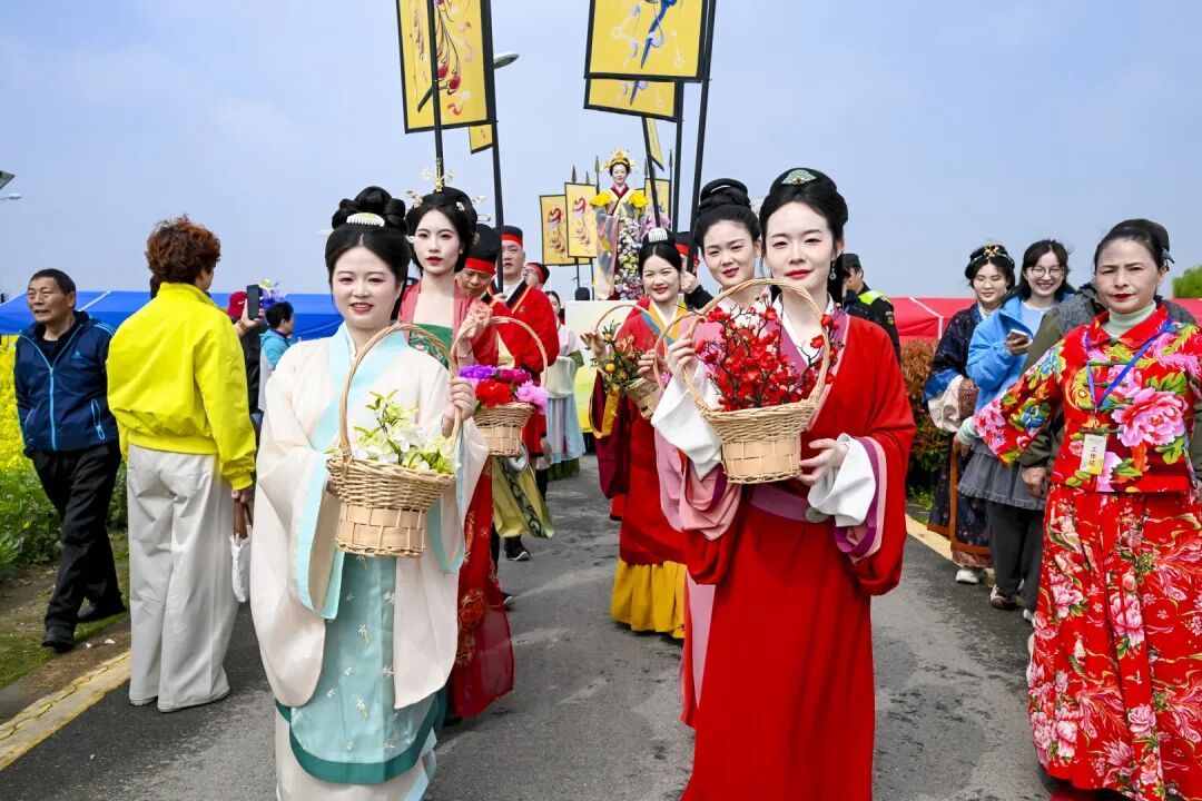 上午,伴随着一曲花神组舞,身着华服的“花神娘娘”携十二位花神缓步走上祈福台,重现古老的“花神祈福”典礼。台下观众仿佛被瞬间拉入时光隧道,共赴这场春日之约。祈福礼成后,花神娘娘登车巡游,车队自主舞台出发,沿着蜿蜒的油菜花径缓缓前行,花瓣随风洒落。市民游客夹道相随,纷纷举起手机,记录下这场传统与春光交织的沉浸式体验。