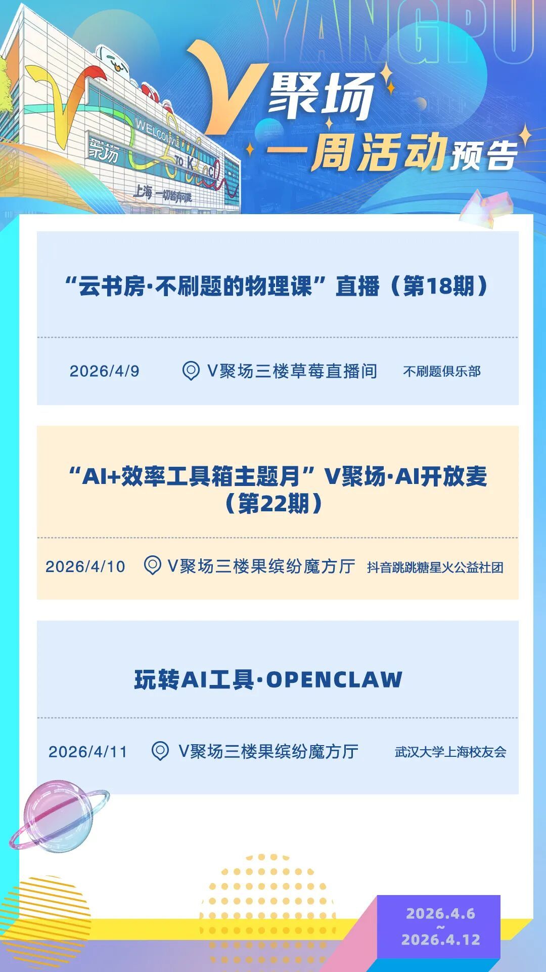 与千万粉丝“UP主”面对面互动,和B站、抖音、小红书等互联网大厂座谈交流,与AI领域创始人探讨人工智能发展新趋势……在杨浦V聚场,随时都有最前沿活动等你来打卡。无论你是互联网从业者,还是创意玩家……这里都将成为你迸发灵感的“能量场”。V聚场4月6日-4月12日一周活动预告来啦!快来碰撞灵感~