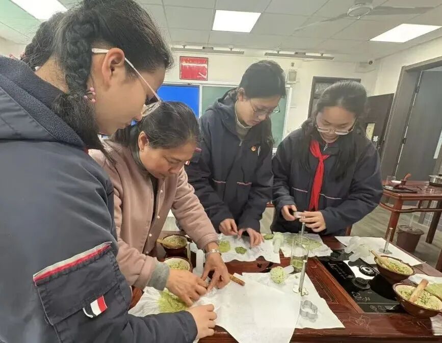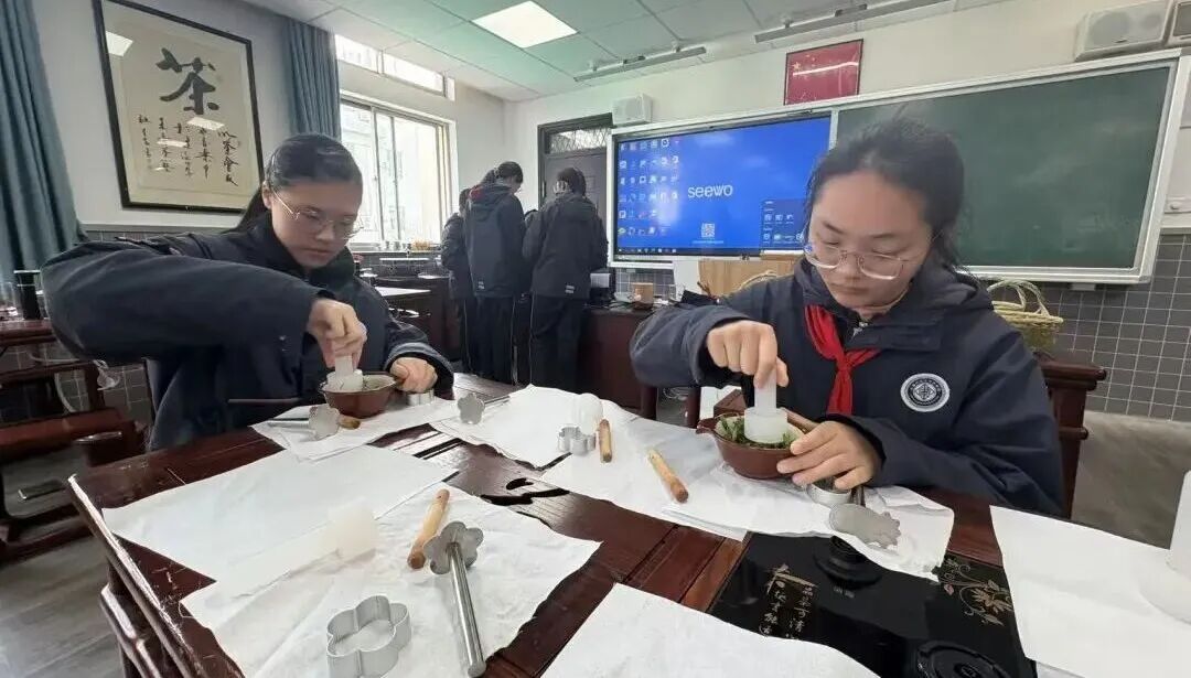 在校园劳动实践基地“阡陌茶庄”与“清瑶茗轩”内,采茶、制茶实践活动火热开展。学生们走进郁郁葱葱的茶园,指尖轻捻嫩绿的茶芽,小心翼翼采下明前新叶,动作轻柔又专注。刚采摘的新鲜茶叶,随即被送往制作品茗区,在茶艺教师孙晓怡的指导下,师生们一同体验蒸青、制饼等传统制茶工艺。蒸汽缭绕间,大家亲手操作、细致打磨,从茶叶杀青到压制成茶饼,每一个环节都一丝不苟,深刻体会“一叶一菩提,一茶一匠心”的传统文化内涵。