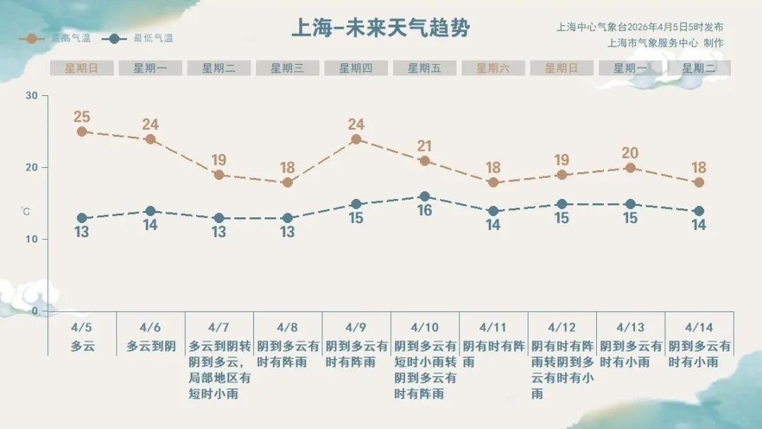 上海中心气象台预计,明日受弱冷空气扩散影响,本市天气以多云到阴为主,气温略有下降,预计在14~24℃左右。假期过后,本市迎来降水天气过程,气温起伏不大,整体在13~24℃。春季天气多变,提醒市民朋友们及时关注预报信息,做好生活及出行安排。