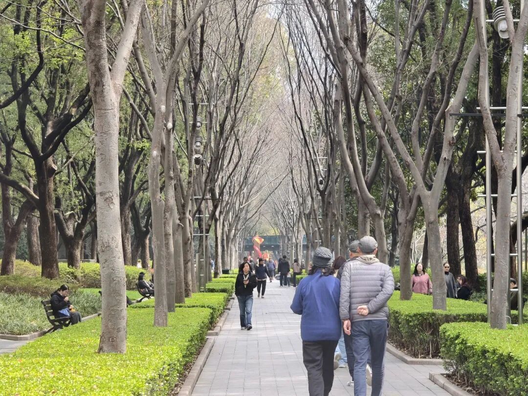 今天白天延续晴朗天气,晴空万里、碧蓝如洗,行走在外能感受到和煦春风拂面而来,明媚阳光带来融融暖意。上午九点,不少市民游客选择来到徐家汇公园踏青赏花,与春花合影的游客邹阿姨告诉记者:“今天风和日丽,各种花都开得很好,适合出来踏青散心,享受春天的美好时光。”