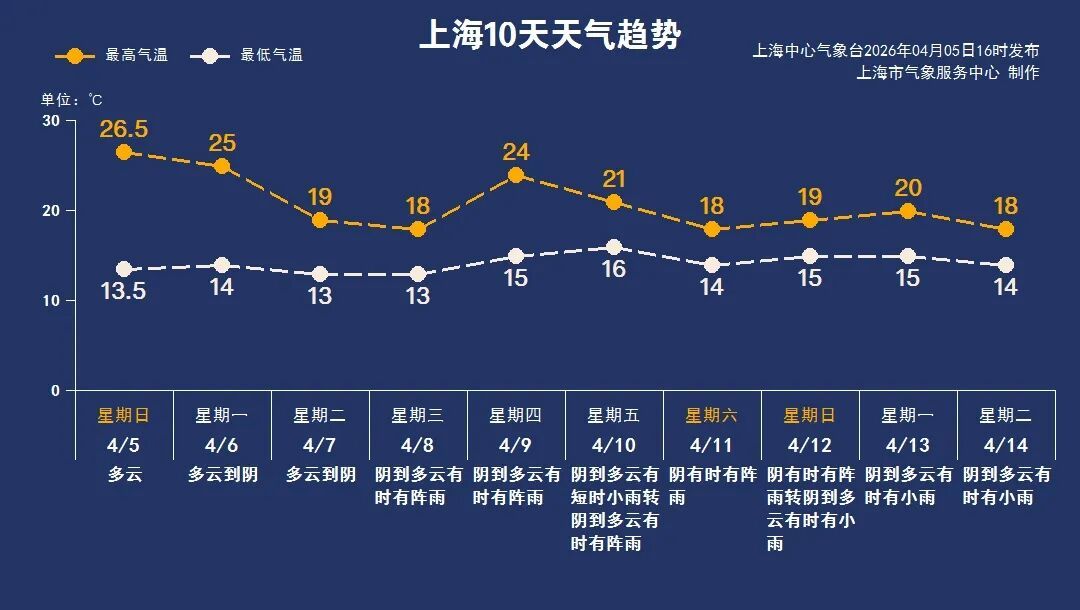 节后首个工作日,多云到阴,气温降至13~19℃之间。本周三起,西南暖湿气流变得活跃,上海多降雨过程。气温起伏不大,整体在13~24℃。春季天气多变,昼夜温差拉大,提醒大家及时关注临近的预报预警信息,安排好生活及出行。