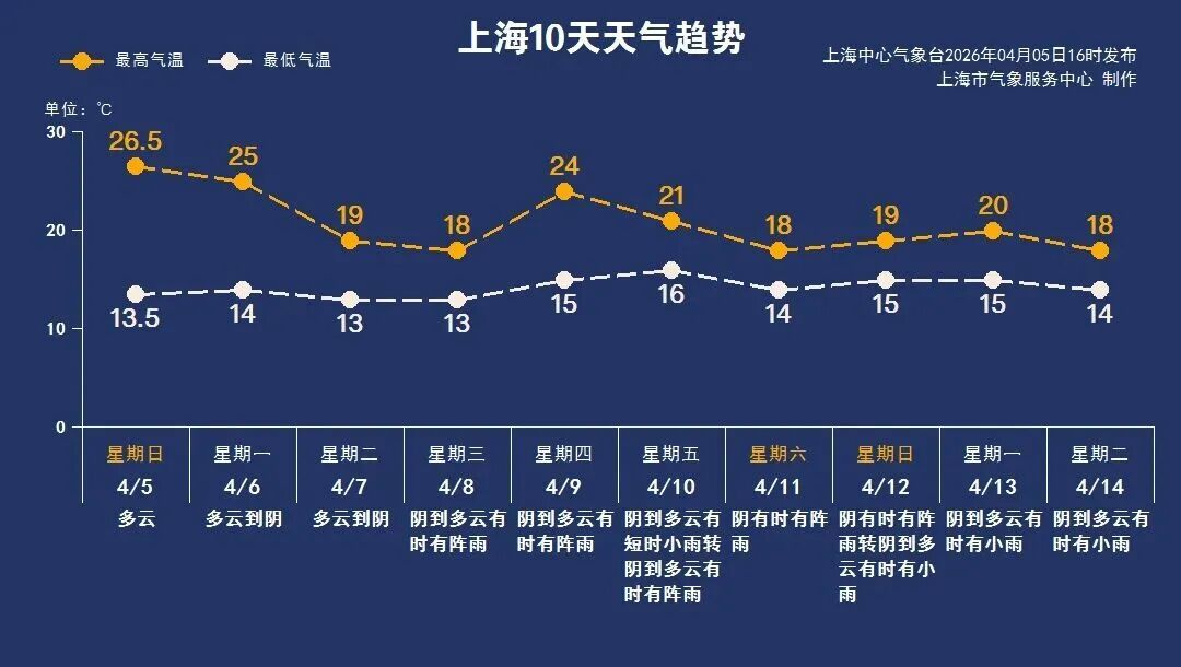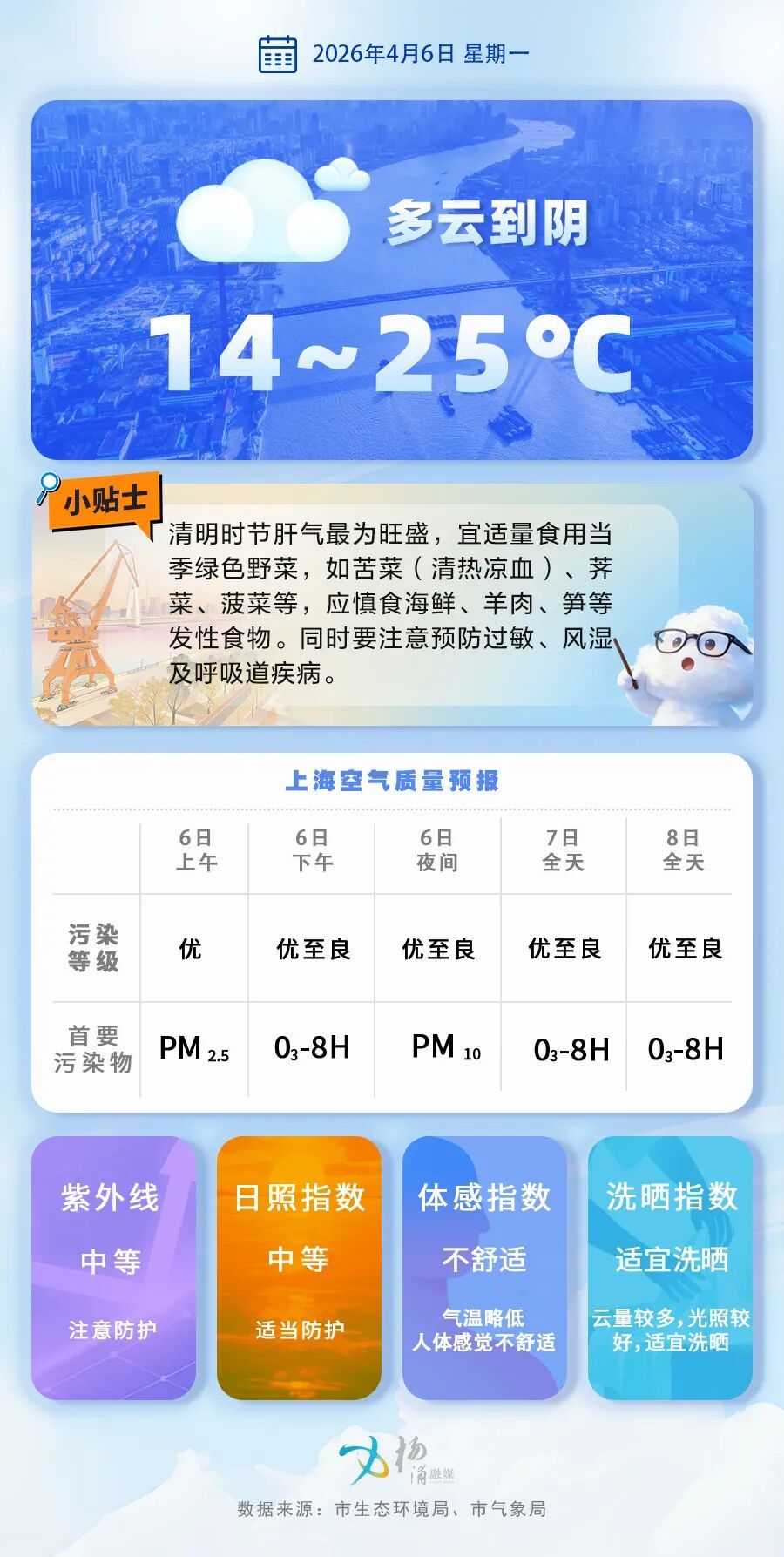 节后首个工作日,多云到阴,气温降至13~19℃之间。下周三起,西南暖湿气流变得活跃,上海多降雨过程。气温起伏不大,整体在13~24℃。春季天气多变,昼夜温差拉大,提醒大家及时关注临近的天气变化,安排好生活及出行。