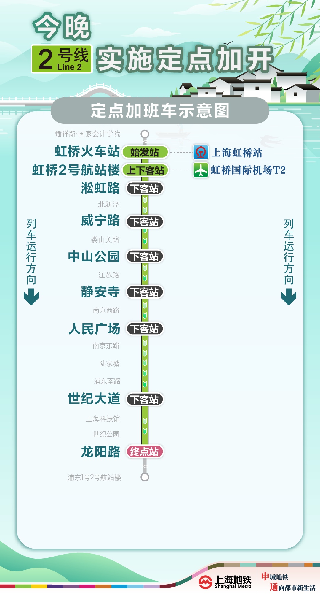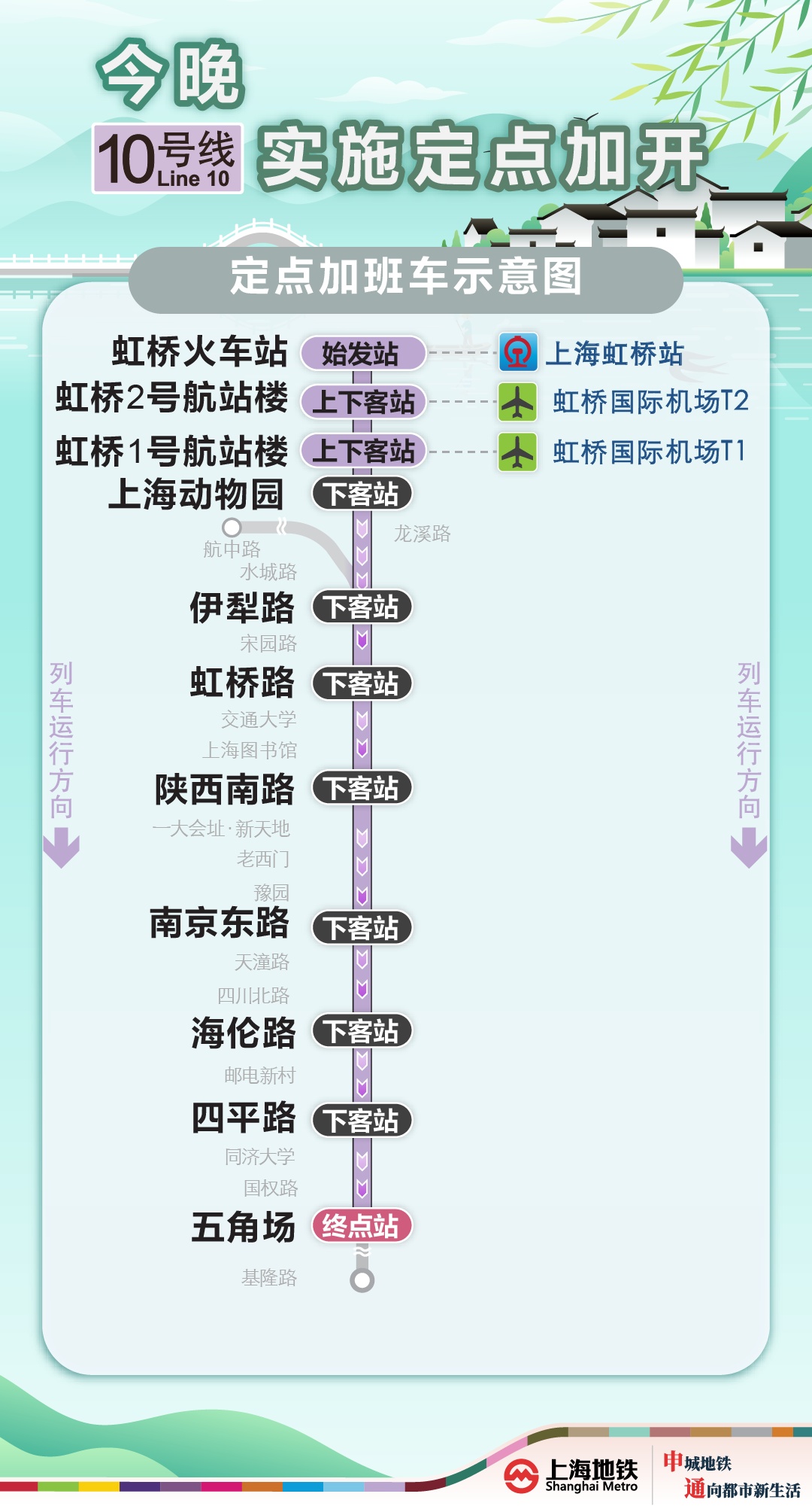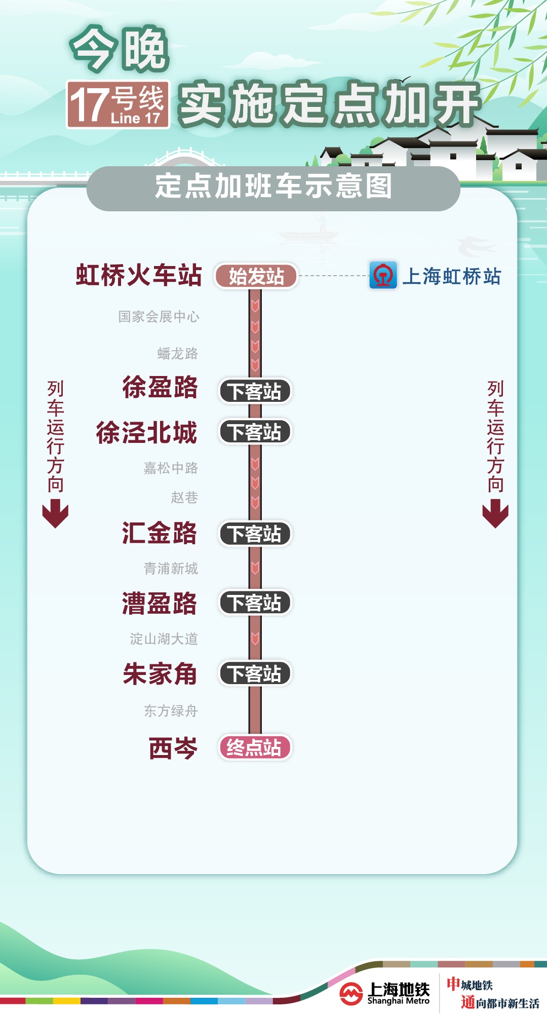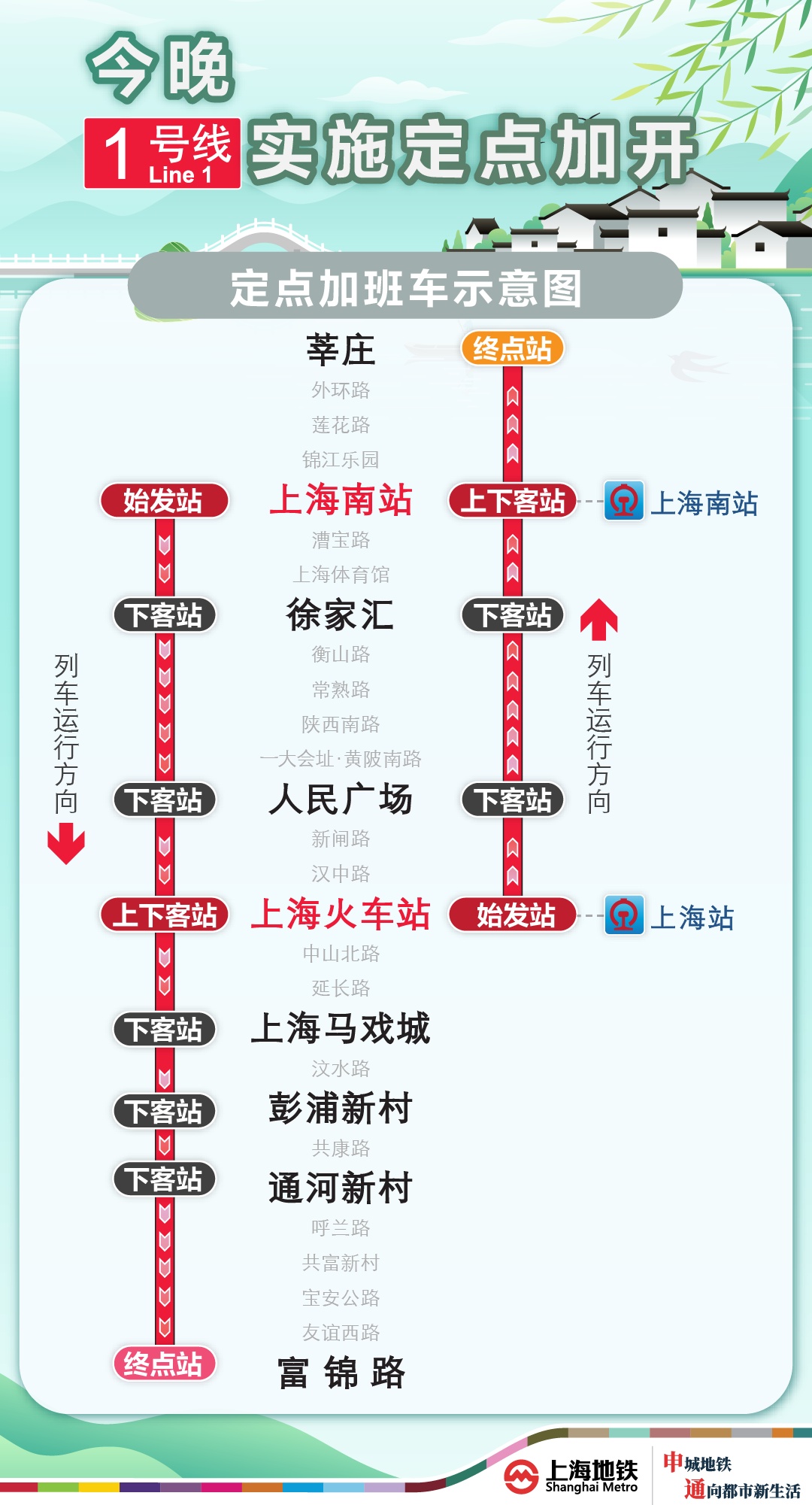 为满足清明返程期间乘客夜间出行需求,今晚(4月6日),1号线加开定点加班车,上海南站站往富锦路站加开至次日(4月7日)0时,上海火车站站往莘庄站加开至次日(4月7日)0时;2号线加开定点加班车,虹桥火车站站往龙阳路站加开至次日(4月7日)0时45分;9号线加开定点加班车,上海松江站站往杨高中路站加开至23时45分;10号线加开定点加班车,虹桥火车站站往五角场站加开至次日(4月7日)0时;17号线加开定点加班车,虹桥火车站站往西岑站加开至次日(4月7日)0时。定点加班车只停靠指定站点。