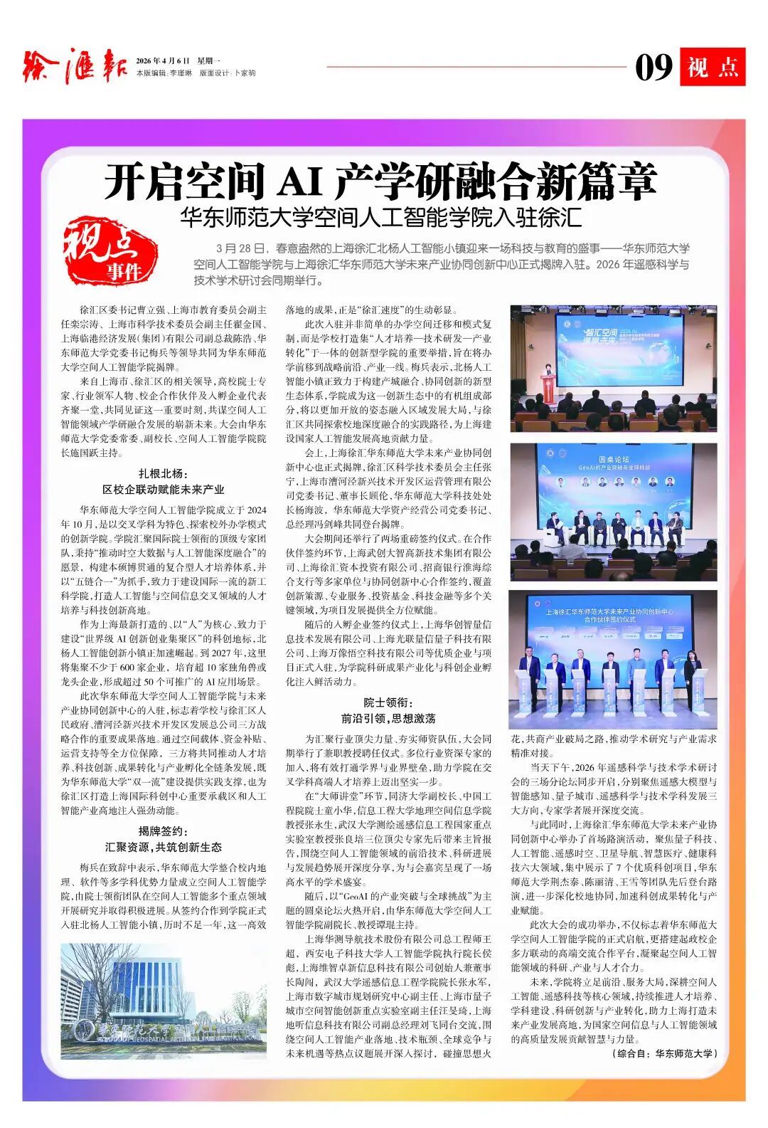 3月28日,华东师大空间人工智能学院入驻徐汇,区校企三方战略合作落地生根。学院由院士领衔,聚焦时空大数据与人工智能深度融合,构建本硕博贯通的人才培养体系。学院入驻为徐汇区打造上海科创中心重要承载区和人工智能高地注入强劲动能。