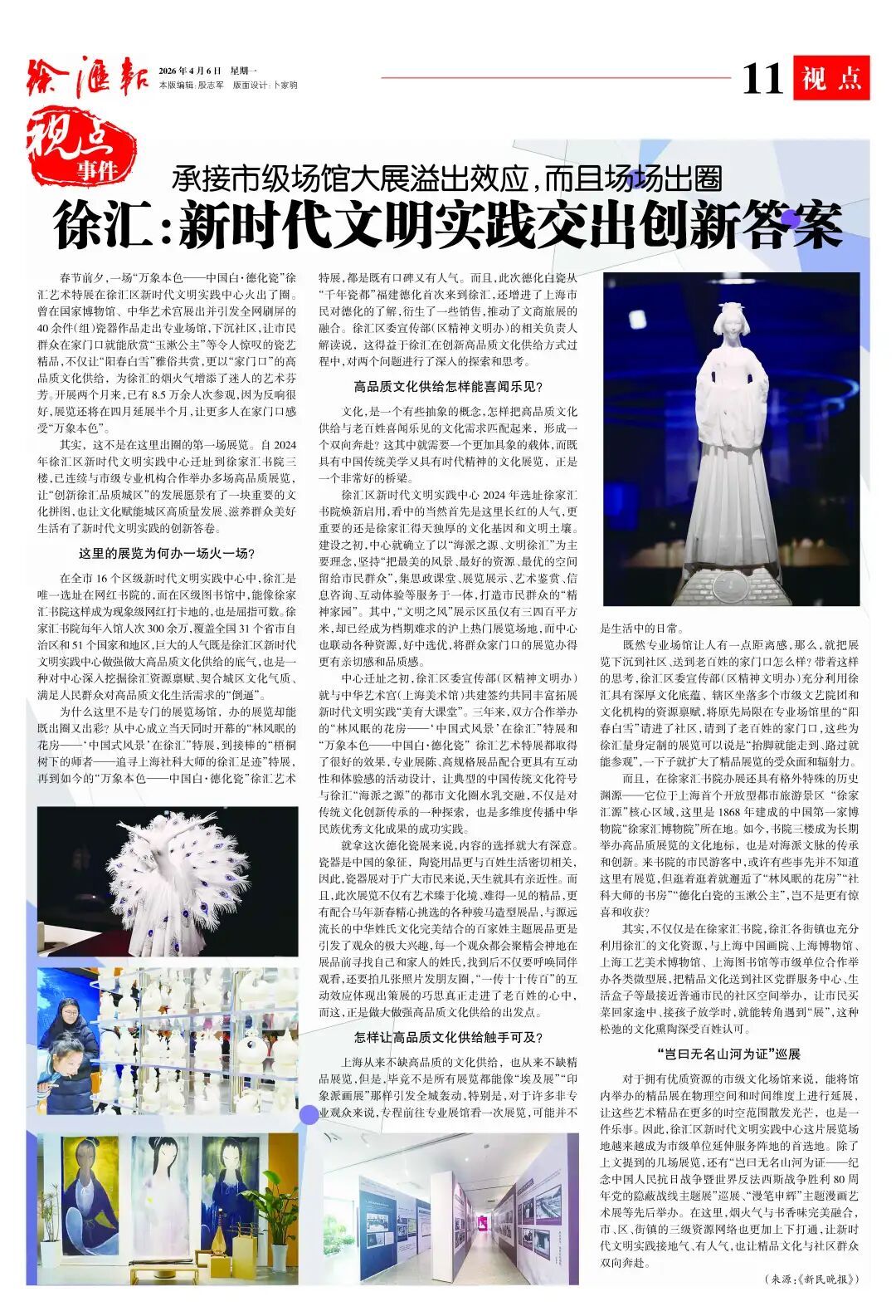 徐汇区新时代文明实践中心选址网红地标徐家汇书院,将“阳春白雪”的高品质展览送到百姓家门口,场场出圈。“中国白·德化瓷”艺术特展两个月就吸引8.5万人次参观,为何既有口碑又有人气?关键在于策展的巧思让传统美学走进百姓心里——百家姓主题引发互动,市、区、街镇资源打通,让精品文化“抬脚就能走到、路过就能参观”。新时代文明实践由此实现了精品文化与社区群众的双向奔赴。