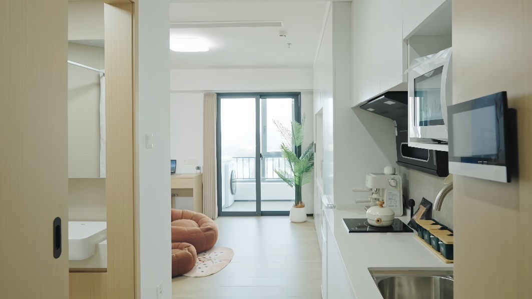 雨宸公寓地处嘉定菊园新区嘉唐公路69号,总高21层的公寓楼整体呈“C”字型结构,主要面向单身青年推出32至45平方米的一室户,724套房源全部精装修交付,真正做到拎包入住。今年3月初刚搬进来的杨林彬,对自己的新家赞不绝口,“看房子的时候,我一眼就看中了它是新房,所有设施都是新的,房间还配有家电家具,不像以前租房还要自己采购,直接就能住。”他租的是一套32平方米的一居室,南北通透,阳台视野开阔。