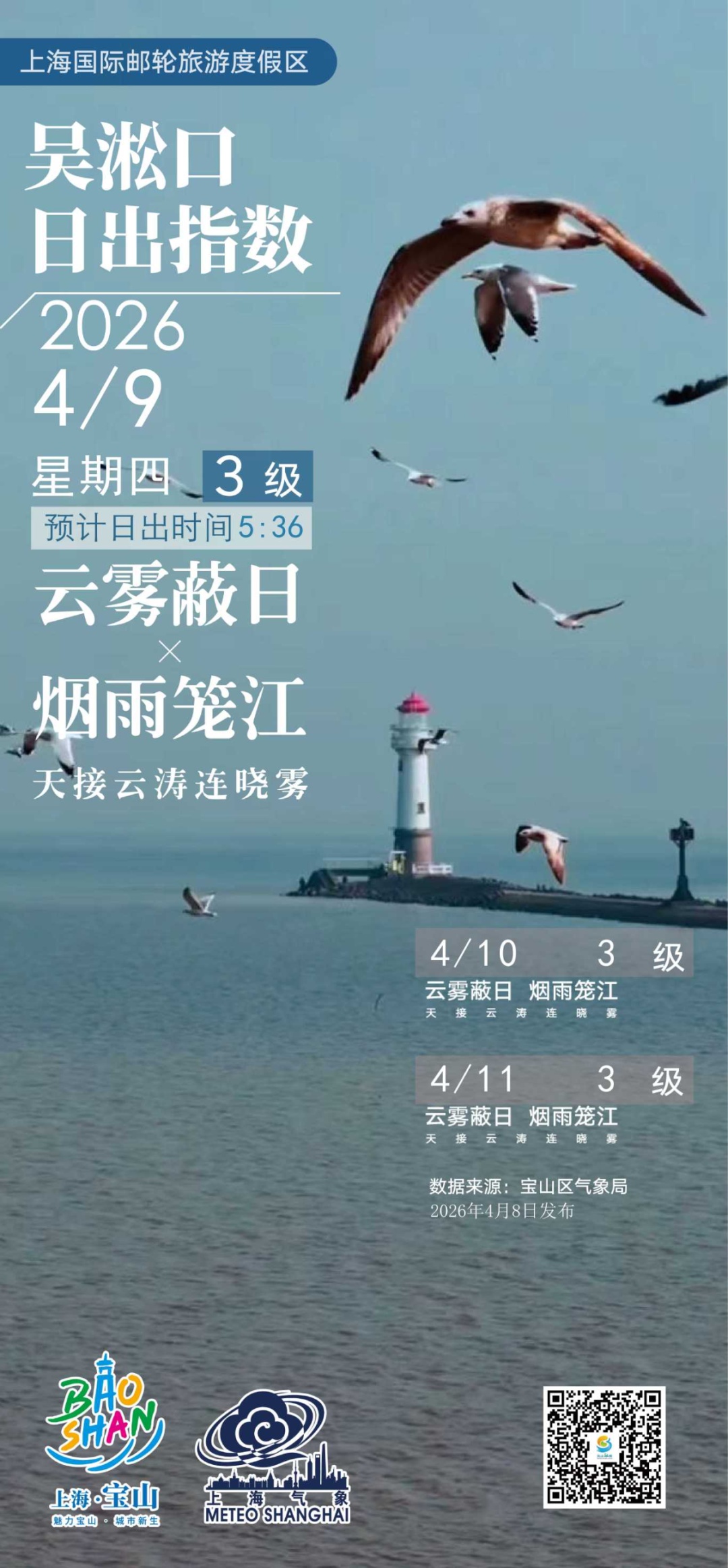 【吴淞口日出指数】4月9日3级 云雾蔽日×烟雨笼江