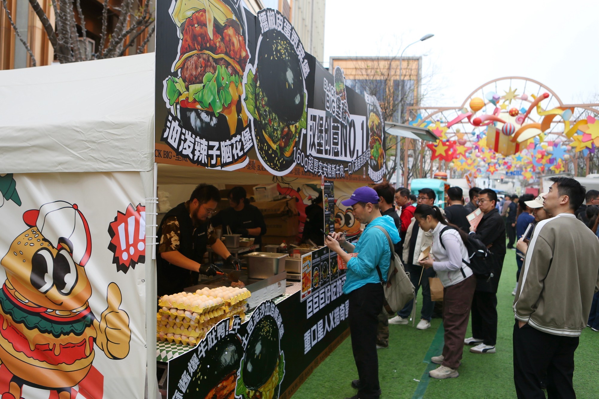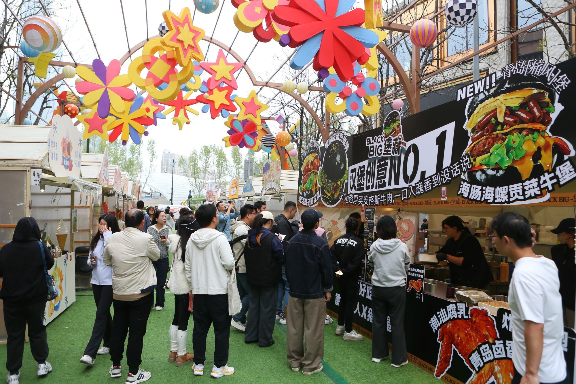 记者注意到,临近中午饭点,现场早已是热火朝天。人们或站或坐,手里捧着比脸还大的汉堡,咬下去的瞬间肉汁四溢,满足感直接写在每个人带笑的脸颊上。