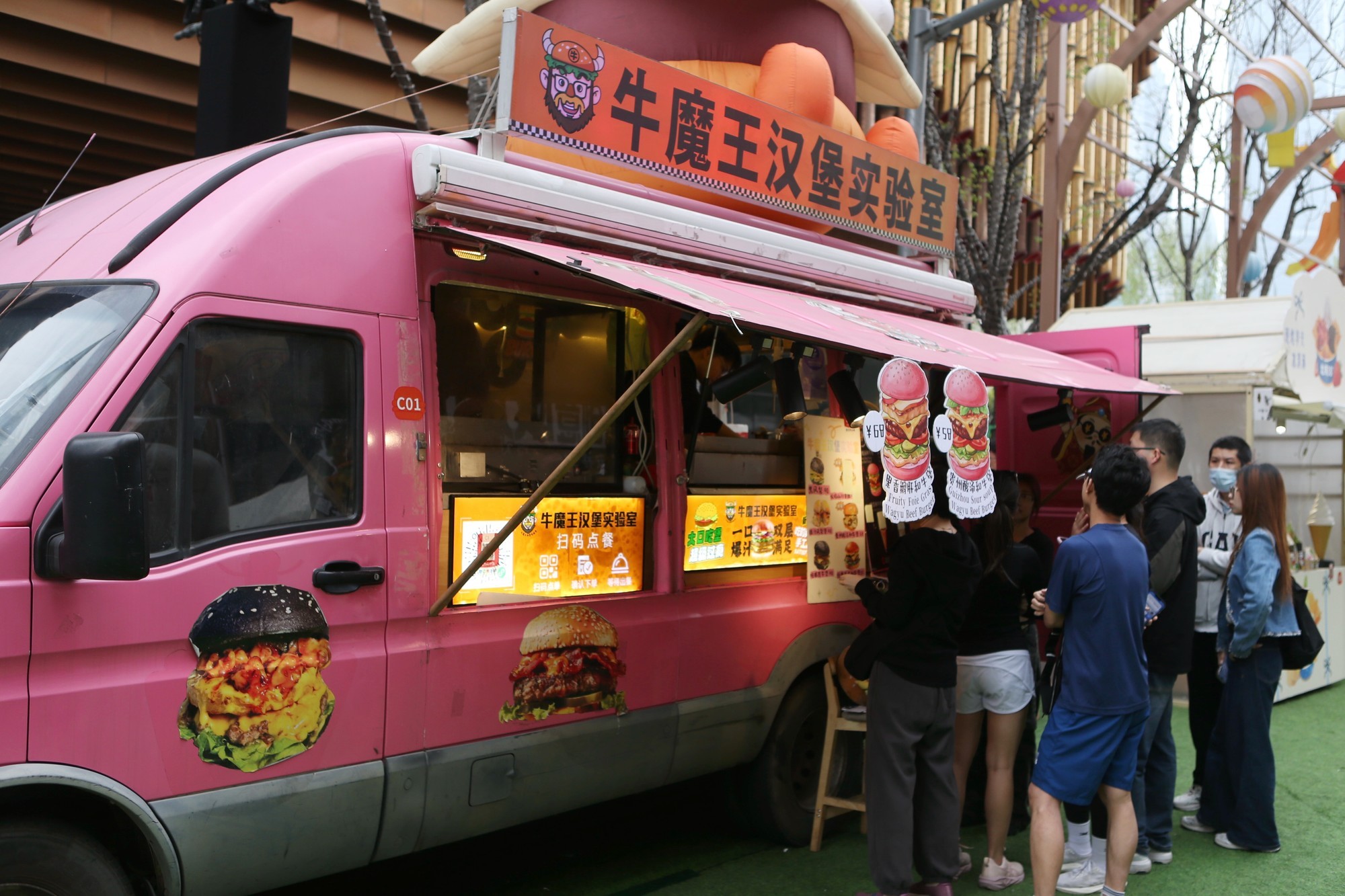 “牛魔王汉堡实验室”是一个来自义乌的品牌,本次活动,主理人直接把餐车开到了现场,粉色的餐车加上牛肉饼散发出的香气让游客排起了长队。聊起此行最大的意义,主理人坦言,一方面可以锻炼如何在市集这样的活动中稳定品控,同时也希望和同行们交流一下心得,包括研发新品的能力,是一个非常好的学习机会。