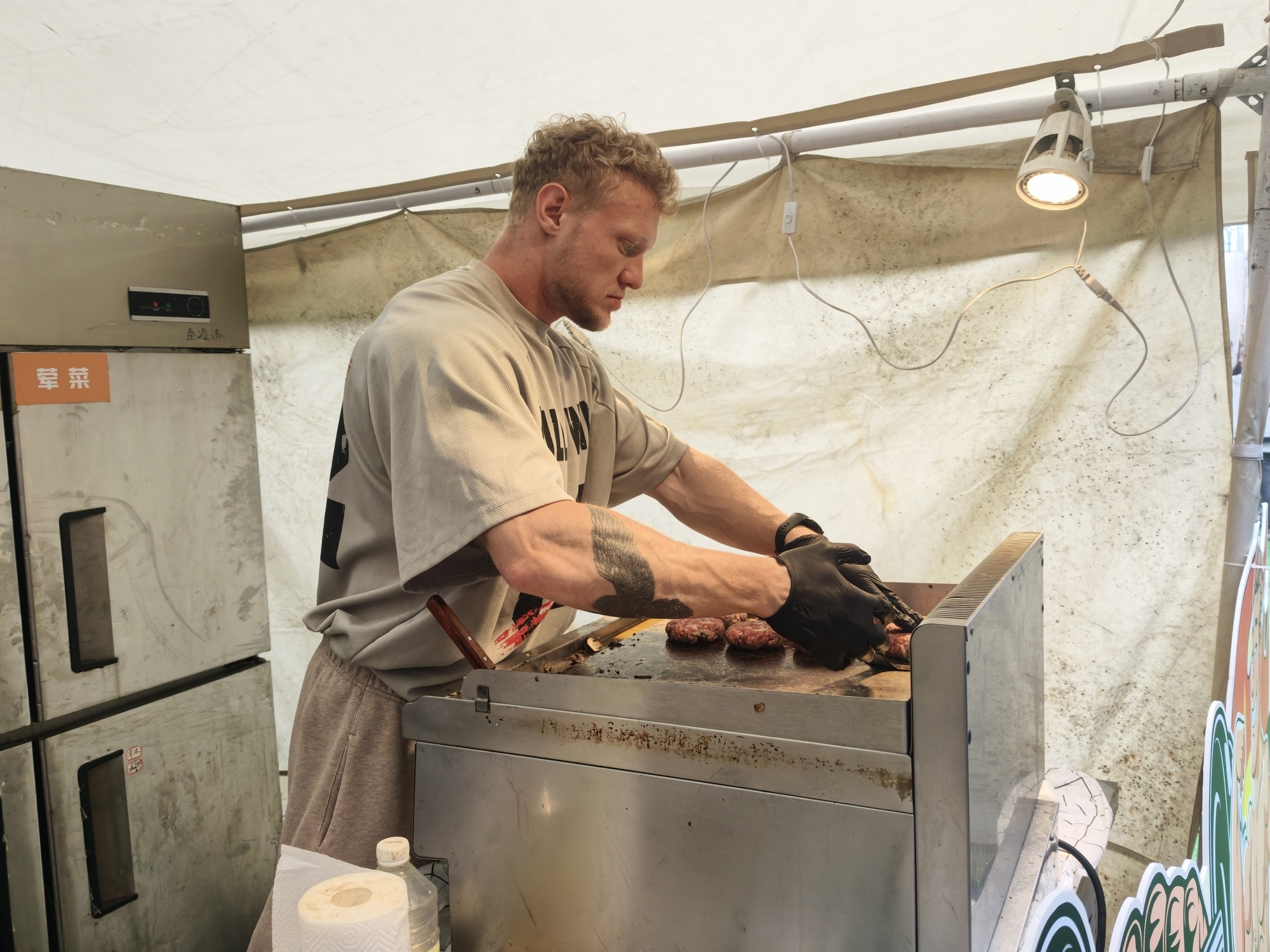 众多摊位中,位于B10的“马老师肌肉汉堡”与众不同。德俄混血的马老师正亲力亲为地煎制牛肉饼,时不时还会用流利的中文和顾客闲聊上几句。他告诉记者,自己的店开在合肥,这是他第五次来上海参加关于汉堡的活动,也希望借此机会让更多人尝到自己的手艺。