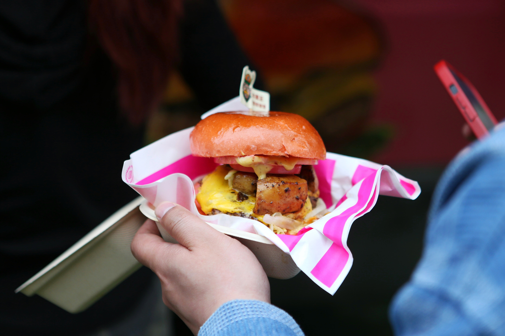 来自青岛的堡藏汉堡,以一款油泼辣子脑花牛肉堡出圈,吸引了一众来往游客的关注。据店员介绍,这款汉堡的创意来源于日常,“我们本身就爱吃脑花,香香的,搭配上偏瘦一点的牛肉,肥瘦可以中和一下,再加上泡菜、油泼辣子,应该是一个不错的搭配。”