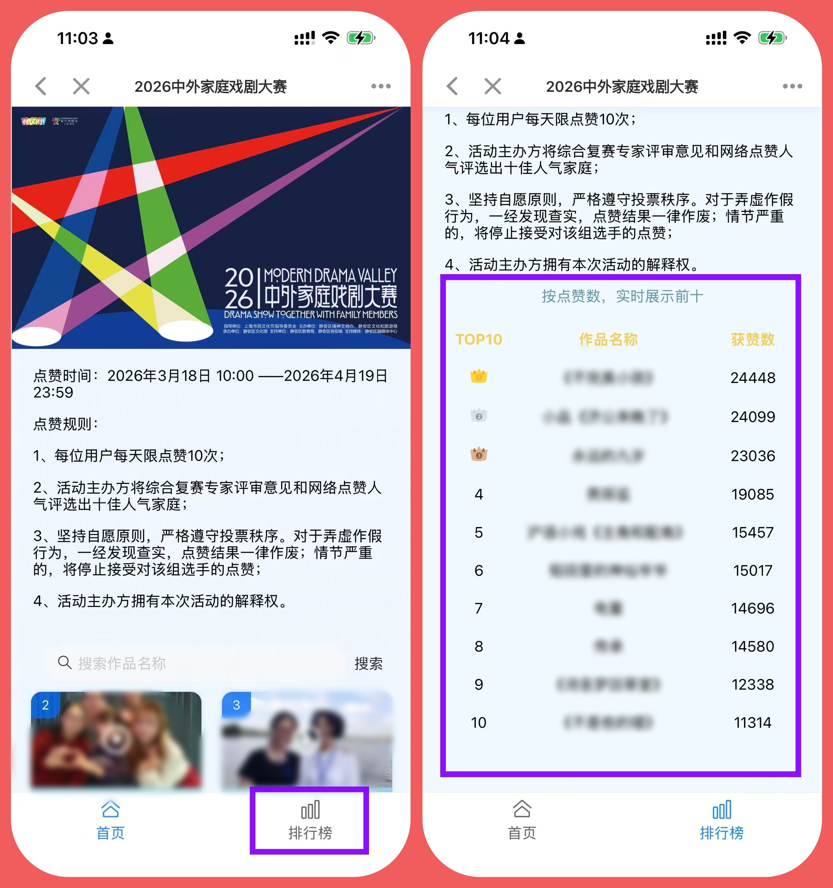 ②首页直达 “2026 中外家庭戏剧大赛” 活动专题,搜索作品名称或直接滑动页面,找到目标作品, “点赞” 完成助力!
