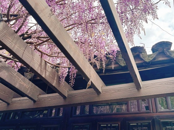 踏入茶于·1946,古色古香的庭院里,紫藤花肆意盛开。淡紫色的花穗随风摇曳,花瓣轻轻飘落,落在青砖黛瓦间,落在古朴的茶席上,勾勒出一幅绝美的江南春景图。